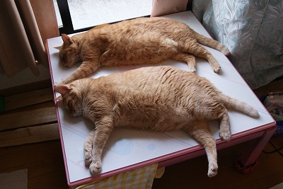 今週に入ってから天気が不安定な日が続きます真夏のカンカン照りのような気温(35℃以上)ではないので扇風機でしのげるのですが、やはり湿度が高いのでしょうか。今日は午前が仕事だったので、朝8時頃にリュウ君の散歩に行ったのですが、家の近くをたった10分歩いただけで、帰宅したら汗だくになっていました夏になってからというもの、私はほぼ連日いったん夜中に目が覚めます。防犯上、窓を閉めて寝ているので、暑くて起きてしまうのですでも夜が明けて外が明るくなり窓を開けると、外から涼しい朝の空気が流れ込んできます。ちょうど自分が寝ている床面のほうに。「冷たい空気は重くて下のほうに流れ込む」 とはこういうことなのですね。部屋の中の暖かい空気と外の空気が、対流して入れ替わるのを実感しています。最近この兄弟は、よくここで一緒に寝ています。これは昼間の写真だけど、明け方の涼しい空気が外から入ってくると、とっても気持ち良さそうにしています。夜は家の近くのスーパー銭湯で岩盤浴をしてきました。私のちょっとした贅沢ですもう痩せる!なんて目標はないです。水を飲んで、汗をかいて、血液循環して疲労回復する。それだけです。少し前までは岩盤浴室内の注意書きが 「お静かに」 だったので、複数で来ている人たちがボソボソと小声ではあってもお喋りしているのがすごく耳障りでした。でも最近は 「会話禁止」 となり、そしてここはマナーの良いお客さんが多いので、安心してゆっくりできます。私と同じように一人で来る客は、どうやらお疲れの方が多い感じです。まあ私は仕事が少なくても贅沢でここに来てるけど、社会人で激務の方は本当に激務だし、対人関係のストレスで疲労が倍増することもありますからね。疲れてフラフラになった身体を岩盤浴でひたすら休める。それが第一の目的でしょう。で、1時間半ほど岩盤浴をしたら、館内着が汗でぐっしょりと濡れてました。いったいどれだけ汗が出たのかな。今度覚えていたら、体重計に乗って計ってみますわ。私の可愛い “癒し隊” たちですこの子たちが私にストレスを与えたなんて、・・・記憶にないです