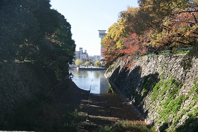 晩秋の名古屋城の風景シリーズのラストです。城内の庭園の木々が陽の光の中でキラキラ輝くのに感動しつつ、でもここは基本 「お城」 。城主ファミリーのお住まい&家臣団の勤務地であるだけでなく、富みと権力を誇示して周囲にニラミを効かせつつ、いざ戦闘となれば防衛の拠点となる場所です。私が長年よくわからなかったのが 『馬出し』 という場所。最初は単純に、ここから馬が出入りする場所かと思っていたら、どうやらそうでもない。立て札の説明を読んでも意味が???。でもそこはPC検索がある便利な今の時代です。たくさんの方が文章での説明だけでなく、オリジナルの図説を入れたりして城郭用語の解説をしてくれています。なので私のアタマでも、やっとわかりましたお城の出入り口(虎口)を防衛するための堅固な設備、なのですね。 ↑ ↑ ↑そういえば、立て札にもこんなように書いてありました。(^ー^;)ただ設備の名称に 「馬」 がつくので、混乱していました。でもあの部分を最初に馬出しと命名した人は、何をイメージして 「馬」 をつけたのでしょうね??では昨日の日記に続き、11月の終わりに 名古屋城 に行って、撮ってきた晩秋の風景です。どうぞご覧くださいませ本丸エリアから出てきました。上の写真は、表二之門を出て左手にある、二の丸エリア方面です。愛知県体育館側から入るときは、こちらになります。下の画像は、馬出しがあった石垣に上がっていく場所です。馬出しの場所に上がって、左右を見渡したところです。名古屋城本丸の南側で、200メートルくらいあります。かつてはこの全面にずらっと多門櫓が建っていました。下の画像の木立の向こうに見えるのが、名古屋城の正門です。陽の光は、あらゆるものをARTにしてくれます。馬出しの上からお城の外堀を覗いいあら、グリーンが綺麗でした。枯れた松の葉も、ライトブラウンでいい感じでした。ところで、現代の名古屋城でお勤めするのは 『名古屋おもてなし武将隊』 だけかと思ったら、違うの方もみえました。帰ろうと正門を出たら、見慣れぬ髷姿の人が。お訊ねしたら、 名古屋城 門番 という方でした。この方のお役目は、ずばり 「門番」 です。おもてなし武将隊のほうが、いつのまにか 「撮影はご遠慮ください」 になっていたので、来場記念はこちらの方々と馬出しのところを、ちょっとART的に。紅葉の名古屋城は見ごたえ十分で、満足でした。