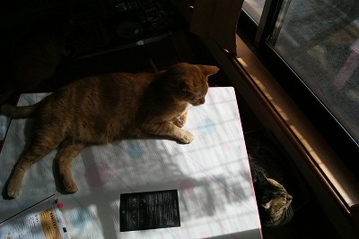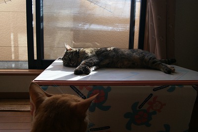 2012年も、ついにあと1日を残すのみとなりました。そしてこの年末だというのに、我が家の録画機器が壊れた・・なので年末年始は録画したいものがあっても ということに。午前中に近くの電化店に行って、とりあえず年明けの修理依頼と、新しく買い換えるときの下見をしてきました。ただHDDに入っているものを取出すのはたぶん無理ということで、HDD内でまだ外のDVDに移していないものは、私のコレクションから消えることになりました。ああーっ!!先日のフィギュアスケート全日本選手権が羽生君が最高の演技をしたあれを、ざっくりと1回観ただけだし、各選手の演技も録画しただけでほとんど観ていないのに・・・ううん、いいわ。来年3月にカナダで開催される世界選手権で、羽生君と高橋君がまた最高の演技を魅せてくれたらさて今年の思い出で、9月に実家ニャンズを預かったときの画像をUPいたします。前回の日記はコチラに ⇒ 楽しい日々でしたにゃ♪ ~その2 ベランダからの風がいい感じで通るこのテーブルの上は、みんにゃが大好きな人気の場所です。そこをミー姉さんが、ゆったりと寝そべっていました。小太郎 : 「ボクもここで寝たいんだけどな。。」ミー姉さん : 「あら、小太郎君、アタシ、ここにいたらダメかしら?」ミー姉さんはこうして、大きなお目目で相手に訴えます。ミー姉さんが行ってしまったので、小太郎もここで寝そべることにしました。小太郎 :「別に居てくれてもいいんだけど、でも、なんかボクたちが遠慮しているんだよね。ここはボクたちのおうちのはずなのにな。」小太郎と康太郎は優しい男の子だから、オバサン お姉様たちに譲るのでしょう。その点リリーちゃんは、オンニャ同士で遠慮がありません。オバサンたちとガンガン張り合っています実家では事情があって、お外に出られないミー姉さん。ベランダまでだけど、ここでは自由に出入りする生活を楽しんでいました