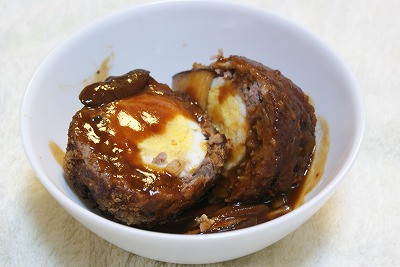 食べたものの画像ですまずは、ゆで卵入りのハンバーグ・・・肉団子?挽き肉があったのでハンバーグにしようと思ったのですが、ちょうど昼にサンドイッチを作ったときにまとめて茹でた卵も残っていました。そこでゆで卵もハンバーグのたねで包むことに。挽き肉には、刻んで炒めたタマネギの他にも、3ミリ角に刻んで軽く茹でたゴボウも入れてあります。なので食感はポリポリになってます。卵をくるんだハンバーグなので、表面にパン粉をまぶして揚げてあります。ソースは、お好みソース+ケチャップを料理酒で煮込んであります。我ながら思いのですが、もうちょっとお洒落に盛り付けできたら・・・反省。さて、スイーツ編。先月、バームクーヘンのいただきものがありましたバームクーヘンなんて、そう味に差はないかと思っていたのですが、大間違いでした。これ、めちゃ美味しいバームクーヘンの中も上品な甘さで美味なのですが、衝撃なのはこの外側の砂糖のコーティング。薄~くカリッとした食感と、くどくない甘さが、とっても美味です思いつくままちょっとアレンジしてみました。まずは、薄味のぜんざい。ただこれは、2種類の甘さがぶつかって互いの味が消えてしまうので、私としてはお薦めできないです。洋菓子なので、生クリームを合わせてみました。クリームを泡立て器でやると後片付けが面倒なのでペットボトルで。汚れないのはいいけど、空気が含まれにくくてなかなか泡立ちません。シェイクする腕が疲れたので、途中でやめました。ちょっとどろりとした生クリームになりました。生クリームをバームクーヘンに合わせるというより、ぜんざいと合わせて食べることになりました。