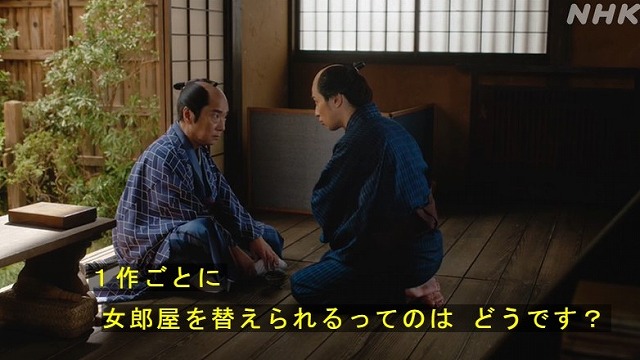 2025年NHK大河ドラマ 『べらぼう〜蔦重栄華乃夢噺〜』のあらすじ及び感想日記です。◇◇◇◇◇◇◇◇◇◇◇◇◇◇◇◇寛政5年(1793)、喜多川歌麿(染谷将太さん)は義兄・蔦屋重三郎(横浜流星さん)の吉原への借金100両の返済代わりとして女郎の大首絵を50枚描くことになり、吉原で女郎たちの絵を描いていました。しかし吉原では、倹約令のために流行るのは安い女郎ばかりで、高級な花魁たちには声がかからなくて景気が悪い、と親父衆は愚痴ばかりこぼしていました。また江戸市中では、錦絵に描かれた看板娘がいる店では割高な料金を取って商売をしていましたが、奉行所からお叱りを受けて元の値に戻していました。一方、江戸城では老中首座の松平定信(井上祐貴さん)が将軍・徳川家斉(城桧吏さん)にオロシャの来航に伴う海防について報告をしていていました。話の後で家斉は、そろそろ政を定信に頼らず自分で指図すべき、と父・一橋治済(生田斗真さん)から話があったと言いました。しかし家斉は、自分は難しいことはわからないし政に興もわかぬと言い、定信が将軍補佐を外れても政に指図するしくみを作って欲しいとのことでした。定信はそのためにも自分が大老になればいいと考え、徳川御三家尾張の徳川宗睦(榎木孝明さん)に相談しました。宗睦は、大老は「井伊」「酒井」「土井」「堀田」の四家からしか出さぬしきたりがあるから無理だと答えました。しかし定信は、家斉が自分を頼っているからなんとか後押しして欲しい、と本気の覚悟を見せていました。宗睦は、家斉が今まで定信を避けていたのに急接近してきて変だとは感じていました。定信は、オロシャのラクスマンが漂流民を引き渡した後も日本に留まって将軍への目通りを願っていて、開国を要求していると目付の村上義礼(大迫一平さん)より報告を受けました。老中の本多忠籌(矢島健一さん)らはオロシャの要求をのんだほうがいいと考えましたが、定信は彼らを早く帰国させるためにも信牌(鎖国中の日本での長崎の入港許可証)を持たせればよいと考え、幕府の公式の返書をしたためて目付に渡しました。信牌を受け取ったラクスマンはエカテリーナ二世に見せるため、すぐに日本を出てオロシャに戻っていきました。この件を定信は将軍・家斉に報告し、その後で定信はある書状を家斉に渡していました。さて吉原では、歌麿が描いた女郎絵ができあがってきて親父衆たちは喜んでいました。親父衆は昔のにぎやかだった頃の昔話に花が咲き、次の企画は何かないかと盛り上がっていました。重三郎は歌麿が吉原を立て直すと皆に宣言し、親父衆もそれを期待していました。ただ当の歌麿は実は気乗りしていなくて、勝手に安請け合いをする重三郎からますます心が離れていきました。そんな話をしていたらふじ(飯島直子さん)たちが、重三郎の身重の妻のてい(橋本愛さん)のために、赤子の着物やおもちゃなどのおさがりをたくさん運んできました。商売も(歌麿頼みで)上向きになりそうだし、まもなく赤子も産まれてと、重三郎は楽しい未来を想像して笑っていました。しかし大量の仕事を持ってこられるだけで重三郎にいいように使われているようにしか思えない歌麿は、まったく笑う気にもなれませんでした。ある日、重三郎の店に鱗形屋孫兵衛の長男の長兵衛(三浦獠太さん)が『金々先生』の大量の版木を譲るといって持ってきてくれて、重三郎はありがたく譲り受けました。話の流れで長兵衛は弟の万次郎(孫兵衛の次男で西村屋の養子;中村莟玉さん)が歌麿はと組んで仕事ができると喜んでいたと重三郎に伝えました。そんなこと初耳だった重三郎は急ぎ歌麿のところに行きました。歌麿は女たちの「恋心」の大首絵を描き終えて重三郎に渡すと、重三郎は歌麿に好きな女がいるのかと喜びました。やっぱり重三郎には人の微妙な気持ちはわからないなと歌麿は自分の思いをわかってもらう気持ちも失せ、淡々と重三郎には本心は言わない、重三郎とはもう仕事をしない、と伝えました。そして歌麿は看板娘の絵を取り出して重三郎に見せ、これまで重三郎が自分に対していかに軽んじてきたかを訴えました。反省する重三郎ですが歌麿の心はもうすっかり離れていました。歌麿は、西村屋の仕事が面白そうだからやりたい、吉原への恩返しは自分なりにやる、と言いました。重三郎が土下座して「なんでもやるから考え直して欲しい」と懇願すると、歌麿は「蔦屋の店を俺にくれ」と言いました。さすがにそれは無理だと重三郎が断ると、歌麿は「結局はそうだろ?俺の欲しいものはなに一つくれない。妻子を大事にしてやれ。」と言って家を出ていきました。重三郎は、今まで気づかず歌麿に嫌な思いをさせてきたことを詫び、これまでずっと自分についてきてくれたことに礼を言い、歌麿は当代一の絵師だと改めて認め、体は大事にしろ、と文をしたためて歌麿の家に置いてきました。店に戻った重三郎は皆に、歌麿はもう自分の仕事
