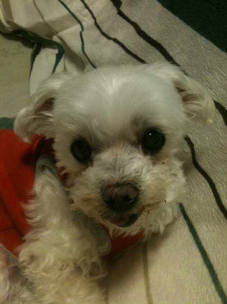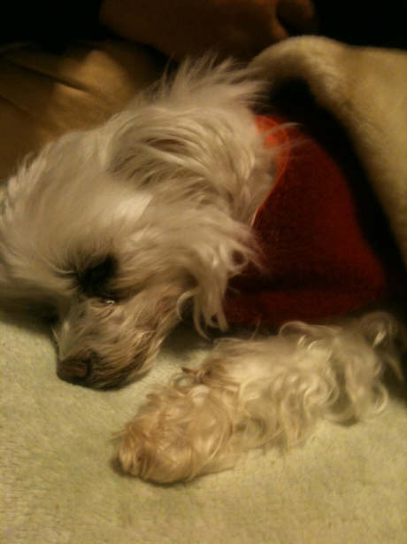 先日、大寒波がやってきた日。我が家の小さいボス、空が、天国へ旅立っていきました亡くなる5日前から全く食べなくなり、水を飲むともどすので、ポカリを飲ませていました。前日まではヨロヨロとあるいていたし、その日も、歩けなくなったけど目はしっかりしていて、私や母をジッと目で追っていました。今日は全然寝ないなと思っていたら、ふと、眠るように息を引き取りました。片手で覆えないくらいに大きくなった腫瘍は、日に2回薬を付けてガーゼを変えて、マナーバンドで保護していたので、化膿する事はありませんでした。次の日、我が家家族4人+2匹、親戚5人、丁度居合わせたお客様1人に見守られ、ペット葬祭さんへ引き取られていきました。火葬の後、お骨を拾う事も出来るのですが、私はとても立ち会う事が出来ません。タマちゃんとステちゃんにも会えたかな・・。空ちゃん、15年間、ありがとう。亡くなる2時間くらい前の姿です。寂しい