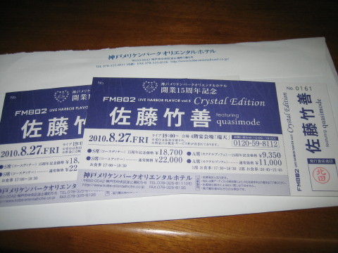 神戸へ一泊旅行、行って来ました~。なぜか宮崎より暑かったです久しぶりのですよ。入道雲が綺麗。神戸空港に発着便が無く、伊丹空港へ降り立つのですが、慣れていないし、昼食をとったらすぐにホテルへ向かいました。部屋からの風景。ホテルの外観は取り損ないました。17時から食事なので、着替えてすぐ受け付けへ。残念ながらサイン入りCDの抽選ははずれおまけに引換券を落としてしまい、もの凄く焦りました。でも、誰かかが拾ってくださったのか、ホテルの方が私の名を呼びながら探してくれていました。良かった~ライブの前なのでワインは控えめに・・・2杯程。ライブは19時から20時半。ちょっと短めですが、中身がぎゅっと詰まった素晴らしいライブでした。詳しくは竹善さんのブログで。一緒に行った叔母は、もっと有名な曲をやって欲しかったようです。私は竹善さんの選曲ってとっても新鮮で、有名なアーティストの曲でも、改めて発見があったり、そこからの出会いがあったりで、どんどん新しい世界が広がるんですが、まあ、そのところを叔母には力説しておきました(笑)竹善さんに出会わなければ、”アル・ジャロウ”とか”小曽根真”とかのCDが、私の棚に並ぶことはなかったと思うし。竹善さんの、ムーンウォークという名の”後ずさり”(笑)ヒロ寺平さんのしゃべり。ドラムの今泉さん(笑い飯の髪の長い方にちょっと似てる)の、顔七変化…ところどころで笑ったりする…。曲以外は笑いっぱなしでしたライブのあとは、最上階のバーでカクテルをいただきました。さんざん食べて飲んだあとなので、お上品に”ミモザ”を一杯だけ夜景も綺麗。とっても楽しかったんだけど、なぜ、同じホテルに泊まって、同じバーで飲んでるのに、竹善さんとは会えないんだろうそこだけが残念でした。翌日、海遊館で人混みにもまれ、空港で人混みにもまれ(花火が上がるらしい)花火は8時から、飛行機は7時40分発で見られなかった(泣)乗った飛行機はプロペラ機。真横に車輪が見えてて、ちょードキドキしながら帰り。でも、夜景がずーっと見られた。ずっと横向いて窓の外眺めていたから変なところが凝ったけど(笑)そして、クタクタになって帰宅しました。神戸、大阪滞在中、4人の方に「何かお探しですか」とか、声を掛けていただきました。タクシーの運転手さんの、「県民ショー」のままのこれぞ大阪!と言う感じに触れ、”アメちゃん”をいっぱいもらって、大阪、神戸、だーいすきそして、そんなきっかけをくれる、竹善さん、だーいすき私も、”3人のお母様方”くらいの年齢になってもライブに行くので、竹善さんもずーっと元気で歌っていてください