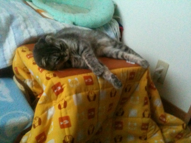 宮崎だって寒いんですよ(笑)とは言っても、この辺りははずれの方でしかも山間。”南国”とはほど遠いです過保護と言われるかもしれませんが、人間用のコタツとは別に、猫用コタツが我が家にはあるのです。人間用のコタツは夜付けっぱなしにする訳には行かないので、こちらはベットサイドに、夜用にと置いてあります。中に入っても、上に乗っても暖かいので、上手く二匹で使ってくれる事を願っていたんですが、中に入ってくれない仕方ないので、もう一つホットカーペット付きベットを足下に置いてます。(奥のグリーンのベット)この辺りって、暖房の風で暖かいので、とっても寒い日は暖房の設定温度を16度にしてると、二匹とも幸せそうに寝ています。莉玖は暖房の風大好き。リビングの猫タワーの一番上は暖房の風がビュービュー当たるのに、いつもここで寝ています。サイズが若干オーバーしてますが、落ちないですあと、テレビの上。ここがまた暖かい。あ、我が家はまだ液晶じゃないので、テレビの上に載れるんですちなみに、テレビの上からは落ちた事があります