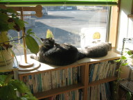 お店に置いてる本や雑誌が増えてきたので、本棚を大きくして、窓際に置きました。本棚設置の理由は、猫たちのためと言った方が多分正直(笑)前は狭い窓枠に無理矢理日向ぼっこしていたので。外から見たら、招き猫が2匹。幸せそうで、何よりです(*^_^*)