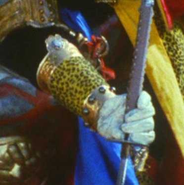 黒影豹馬の豹柄の布地の手甲が、ブラックジャガーになると白いグローブと豹柄の生地と金色の生地に宝飾のついた豪華なアームガードに変身する