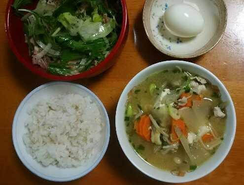 豚汁、ぺkパーシンケンと水菜のサラダ、ゆでたまごです。