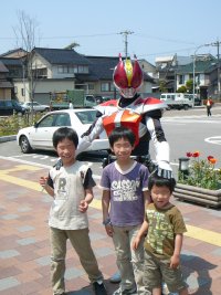 今日はとっても暖かくていいお天気だった。お天気のいい日に家でじっとしているというのがどうも苦手な我が家。どっか行かなきゃって思っちゃうのよね~。遠出をすると疲れるので近場でパパとママが色々探した結果、例のたいぶーのまぶしい笑顔が貼ってあるスマイル○ート○ムの記念イベントが催されている港町に行くことにした。という訳で、昨日書くといっていた小学校での事件は明日・・・。現実逃避ママとたいぶーは最寄の駅から終点まで乗ったのだけれど、パパとツインズは運動がてら二駅先まで自転車でこいで、そこからママたちの路面電車に合流することになった。駅でたいぶーと電車を待っているとやってきたのはなんとまたまた例のたいぶーの電車。ラッキー♪でも貼られているのは外なので見えなーい。パパたちとも無事合流して終着駅へ。すると駅のホームで出迎えてくれたのは、な、なんと・・・・ 仮面ライダー電王!ここでなにやってんの?・・・って知らん。うち、見てないモン。でも子供たちは大喜び。仕草がなかなか決まっている電王だったのでツインズが一言「かっこいい」とホレたようだった。仮面ライダーと握手した後はイベント会場へ。会場には結構面白そうなエアー遊具(中でトランポリンみたいにして遊べるやつ)とかもちろん仮面ライダーショーもあったし、タダでお餅も食べれたし、キックターゲットもあったし・・・・なかなかの盛り上がり。たいぶーやツインズのお友達ともたくさん会いました。港町なので食べ物も浜焼きやら海鮮ものがたくさん。でもやはり今は白エビが旬なので白エビカレーや白エビかき揚げうどんとか白エビコロッケといった白エビ尽くしを味わった。 でもこのイベントの中で一番の(ママの)目当ては似顔絵師による似顔絵ライブ。以前ぽっちゃまさんが描いてもらってるのを見てうちも機会があったら描いてもらいたいと思っていたのよね~♪ツインズをどういう風に描きわけるのかなっていうのも興味があった。で、描きあがったのがこちら。 いかがでしょう?皆はたいぶーが似てるって言うんだけど、私はツインズの特徴をよくとらえてるなって気がするなぁ・・・。どちらがユー兄でどちらがショー兄かわかる?これは我が家の宝物にします♪色々イベントを楽しんだ後、駅に着くと待っていたのはまさかとは思ったけどまたまたたいぶーの笑顔の電車だった。何種類かの電車が走ってるはずなのに縁があるのね~。今日はなかなか楽しい一日でした♪