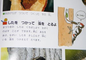 さすがに年中さんから英語教室に通ってるだけあって、そこそこ英語の単語力がついてきたツインズ。英語教室の宿題をしていたユー兄がふと聞いてきた。「ママ、ピーマンってgreen pepperだよね?じゃあさ、赤ピーマンって英語でパプリカなの?」なぬ?パプリカは違いまっせ。「レッドペッパー・・・・・はとうがらしだから。あれ?赤ピーマンってなんていうんだ?」 レッドグリーンペッパーって事はないよね。何だろう?ママ、わかりません。仕方ないので辞書で調べると・・・・・red bell pepper とか red pemiento っていうらしい。それであってるでしょうか、Mika◎Momさん?そして、もう一つ。国語の長文読解をしていたツインズ。その長文の中に、「キツツキは先のとがったくちばしで木の幹をつつき、穴をあけ、中にいる虫をとって食べる。」と書かれた箇所があった。問題で「キツツキはどのようにして餌をとりますか?」との問いにユー兄は「木をつついてべろをのばして虫を取る」と答えていてパパに×をされていた。ソレを見たママはユー兄に言いました。「まぁ、文章の中にない言葉を勝手に作って答えちゃだめだよ。だいたい、『べろをのばして』って何なのよ。カメレオンじゃあるまいし。長いくちばしを穴に入れて虫をつかむんやろ?きつつきの舌がくちばしより長くビヨ~ンってカメレオンみたいになるってことはさすがにないやろう~。」と笑うと、ツインズが口々に大反論してきた。「そんなことないよ!だって本に書いてあったもん!」と真剣な顔で訴える。するとパパも「まぁまぁ、こいつらの言う事も間違ってないねん。話聞いたってやれ。」ツインズが子供部屋に駆け出して鳥の本を持ってきた。そこにはこう書いてありました。 マ、マ、マ、マジっすか?!き、きつつきさんの舌ってそんなカメレオンみたいに伸びるんですか!ウチのパパも自分の舌を自分の鼻の穴につっこめるくらい衝撃的に長いけどそれと一緒やね?知りませんでした。無知?いやぁ~、子供の勉強につきあってるとママも日々勉強になります。