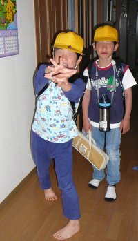 しっかり者の守銭奴ショー兄とうっかり者のやさしいユー兄。それが我が家のツインズ。ここでやはりクローズアップすべきはユー兄のうっかり性の事だろう。先日の家庭訪問で先生から「一年生の最初の頃からすると随分と落ち着いてこられて忘れ物やなくし物も少なくなったし、お友達にも優しいくてしっかりしてきた感じです。まったく問題ないですよ~」と優しい言葉を掛けていただいたその日に実は筆箱を一式忘れていったユー兄。さらに。一年生のときは雨天時の登下校には雨合羽を着るように指定されてるけれども、2年生以降は傘をさしてもよいことになっている。でも雨が降っているときはともかく、雨が降っていないときの傘の扱いがまだまだあやしいツインズにはあぶなっかしくて許可できない。もうトラブルはごめんだだから傘は持っているけれど、使っていいのは英語教室とそろばん教室のときだけ。なのにこの間ふとお友達の家に行くのに持たせようと傘立てを見るとショー兄の傘しかなくユー兄の黄色いポケモンの傘が見当たらなかった。このヤロ~、またか・・・とユー兄を問い詰めるものの、傘を使ったのは数週間前と思われいまとなってはどこに忘れてきたのか心当たりがないという。ま、結局そろばん教室で忘れられた傘を発見できたのでよかったのだけれど、ここのところまた忘れ物癖が復活のきざしを見せている。とにかくユー兄ってばうっかりものなんだよね~。いまだに服を前後ろ反対に着てたりしてママをあきれさせる。一つのことを考えると周りが見えずひたすら一直線に突き進むイノシシのようなタイプだ。だから駐車場で車の前に飛び出してパパに怒られることもしょっちゅう。もう2年生なんだけどねぇ・・・・。そんなユー兄ワールドへ皆さんをお誘いしましょう。今朝のこと、ご飯も食べ、歯も磨き、トイレも済ませ、ランドセルもしょったユー兄。さぁ行こうってな感じになっていて、ママはその姿を見てため息をついて首を振るしかなかった。ママ:「ユー兄、ショー兄、写真撮ってあげる。さぁ笑ってぇ~」するとユー兄、見たこともないくせにドラゴンボールのマネをしてカメハメハのポーズ。 バカちゃう?ママ:「いいねぇ~♪ ほんじゃ、もういっちょ撮ろうか、横向いてぇ~」 すると素直に横を向き、またまたカメハメハーッ!!まだ気づかないようだ。ホンマにあほや。そのまんま行ってしまえ。そう思っていたら、それを見ていたたいぶーが「ユー兄、なぁ~んかへんだなぁ~」とニヤニヤしながら言ってしまった。自分の服を見てハッと気づいたユー兄。「あーっ、パジャマのまんまだった!!」そのまま学校へ行って恥をかいてくれば身にしみたろうに。たいぶーの余計な一言のせいで救われたユー兄だったのでした~。