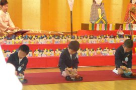 昨日、会社から帰ってきたパパがママのブログを読んで呆れたように言った。「食わせたんか!?」だって本人が食べるって言ったんだもん。実は結構嬉しそうにイソイソと食べようとしてたんだけど、それじゃあブログネタに合わないからとママが「たいぶー、悲しそうな顔してごらん」と要求して撮った写真だったのだ。おにぎりだけ食べた・・・と書いたので「さすがに残りは食わせんかったんやな。」とホッとしたようにパパが言ったんだけど・・・。実は捨てるのがもったいない気がして、夕食をたらふく食べた後のテーブルに何気なくそっと残り物の入ったお弁当箱をそのままテーブルに置いたら、ハイエナ3匹があっという間に食い尽くしてしまったので捨てずに済んだのであった。ママは食べずでも三人とも・・・今日も元気です。さて、今日は卒園前の最後のイベント、『ひな祭り茶会』。年少さんの時から幼稚園で習ってきた茶道の集大成(?)を披露してくれる。自分達で手作りしたお茶碗にお茶を立てて静々と運んできてくれて、ママの前に置いて一礼して下がっていくのだ。 男の子は皆濃い色のシブイ茶碗なのに、なぜかたいぶーだけがパステルピンク ピンク大好きユー兄ですら白に抑えてたのに・・・・。たいぶー曰く、茶碗の底にはカービィを描いたのでピンクにしたんだとか。カービィって前もって言われてなければ、何を描いたのか全くわからなかったけどね。BGMに本物のお琴を弾いてくれる方もいたりして・・・・。お茶の前に運んでくれていた手作りの雲平やお餅と一緒に美味しく頂きました。 お茶を頂いた後は子供達によるひな祭りの歌の合唱。 あっという間に終わってしまったけれど、これは入園した頃は小さかった我が子がお客様に上手にお茶を立てられるまでに成長したという事をひしひしと感じて結構感動するもの。兄ちゃんの時ほどの感動はなかったけど、やっぱり感慨深い。たいぶーもなんとか一年生としてやっていけそう。お茶会の後はクラスのママ友と最後のランチを楽しんだママ。あとはもう卒園式を残すのみ。残り少ない園生活を楽しんでくれたらいいな。