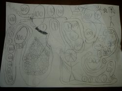 たいぶーは下手ではあるんだけど、絵を描くのが大好き。最近では幼稚園から帰ってくると絵の具を出してきてせっせと絵を描き始める。朝顔の絵しか描かないもんだから「どぉ?」って聞かれてもコメントに困っていた。「同じ絵ばかりじゃなくて色んな絵をかいてみたらどう?」と勧めてからは山の絵やイルカの絵を描いたりと色々描くようになった。今日も幼稚園から帰ってくると絵を描き始めたんだけど、絵の具も出さずにえんぴつで熱心に絵を描いていた。何を描いてるのかなって覗いてみると・・・。 ママ:「た・・・・たいちゃん、これ・・・まさかとは思うけど何・・・?」たいぶー:「えっとぉ、1円玉とぉ~、100円玉とぉ~、おかねのめいろ。」やっぱり。・・・何か思い出しませんか。前にもあったよね、似たようなこと。我家の守銭奴が2名に増えた。たいぶーまでが子供のクセに夢もなくこんな絵を描くなんて・・・。あたしやっぱり。育て方を間違ってるんやね。どこがアカンかったん~っ