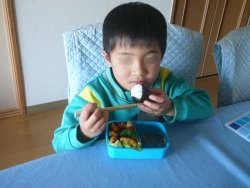 バカ・・・・・・。それは私。3月の卒園を控えるたいぶー。週一度のお弁当も今日を入れてあと3回。兄ちゃんの入園から6年間、一度もかかさず頑張ったよなぁ、私。面倒なお弁当もあとちょっとで作らなくていいのかと思うと嬉しくて待ち遠しくて仕方ない。でも最後の一回ぐらいはまたキャラ弁してやるかな~なんて思ってる。今日、たいぶーが幼稚園から帰ってきてバスから降りると開口一番に、「マ~マ~、今日、おかあさん弁当の日だったのに入ってなかった。」は?何言ってんの、作ったよ。朝も5時半から起きて、キャラ弁ではないけど普通の弁当を。・・・・・。はっ。そういえば、朝にお弁当を作り終え、朝食の準備をするのに邪魔だからとコンロの奥にふたをかぶせてポンと置いた記憶が・・・・。ギャ~~~ッ!!!何っ!!あれはじゃぁ・・・あのまんまあそこに???こんな暖かい日に常温でコンロのそばにずっと今まで???腐っとるんちゃうか・・・。お昼は冷蔵庫の残り物を食べたママ。コンロのほうには見向きもしなかった。ああ、あたしってばバカ!!何のために朝早く起きて作ったのよぉ~。エレベーターに乗っていると「ごめんなさい」とたいぶーがポツンとささやいた。コップやお箸など幼稚園の準備は自分でするようにしてるものだからママがお弁当を作ったのに入れるのを忘れた自分が悪いと思ったようだ。別にいいよ、ママがお弁当をすっかり忘れて渡さなかったのが悪いんだからと言ったんだけど悲しくなったのかポロポロ泣き出した。かわいそうにお弁当を忘れた子は先生がパンを1個買ってくれるらしいのだけど、カレーを5杯もお替りするたいぶーがそんなんで足りるわけがない。先生も一度電話の一本でもくれてたらよかったのになぁ。ま、気づかなかった私が悪いんだけど・・・。さぞお腹がすいただろう。この春めいた暖かい日に常温で台所に放っておいたお弁当には危険がありそうだけどとりあえず・・・。食べたまえ。 悲しげだ ・・・・おにぎりだけ食べたたいぶーだったのでした。