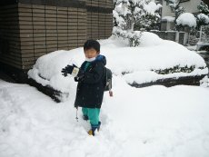 今年は本当に雪が多い。東京方面で雪が降っただの積もっただのと騒いでた日にはこっちはまったく降っていなかったのに、翌日からずっと雪が降り続き・・・。せっかくやっと雪が消えたと思ったのに再び大雪。このあたりは50cmほど積もったらしい。またしばらくテニス出来なくなったやんか。もうええねん。 たいぶーは喜んでおります。話は変わりますが・・・。髪の毛薄々家系の私と、髪の毛濃々家系のパパの間に生まれた三兄弟なんだけど、なぜか今のところは三人とも薄々家系を一直線。1本抜けても10本生えてくるんじゃないかというくらい鬱陶しいパパの髪にどうして似なかったのか。10本抜けても1本しか生えてこないママの家系の哀れな三人。とにかく髪の毛をよく梳いて頭に適度な刺激を与えるのがよいと聞く。少しでもハゲを遅らせられるのであれば何でもしてやりたい。それに身だしなみの事もあるし・・・と思い、昨日三兄弟に言い聞かせた。「いい?もう高学年にもなろうというんだからこれからは自分で朝、鏡を見て、髪の毛がハネていたら櫛に水をつけて梳く!ハネてなくてもとりあえず一回は櫛を通して髪を整えなさい。身だしなみなんやからね!」そう教えたのだった。でも兄ちゃんはすぐに忘れる。こんだけ頭がハネてて、洗面所の鏡の前に立ったときにどうして気にならないのかわからん。誰か女の子が指摘して笑いものにしてくれたらいい薬なんやけどなぁ。で、兄ちゃんは今日は一応髪を梳いていった。もちろんママが一言添えたからやったんだけど・・・。でもたいぶーは忘れてなかった。ママが知らない間に洗面所の鏡の前に立ち・・・・。一人で櫛を梳かしていたようだ。方向性が定まりすぎたのか・・・・ 完璧な七・三たいぶーが出来上がっていたのでした。
