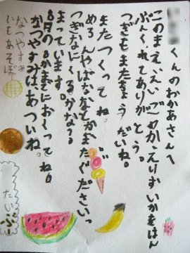 我家ではスイカを買うことがまずない。スイカに限らず冬のミカンだって買うことはない。子供達は大好きなんだけど、なんせスーパーで買うものが多いPikamama家では余計なものを買うような重量的余裕がないのだ。2日分の食事を買うともうかごはいっぱいだ。今日もスーパーで特売の牛乳6本とヨーグルト2つを買って今日の分の夕食を買ったら山盛りになってしまった。可哀相だけどスイカは毎年諦めてもらっている。そんな我家に今年初のスイカをもたらしてくれたのはママ友なまりんさん。なにやら近所のお店のイベントでゲットしたので半玉いらない?と言ってくれたのだ。もちろん即答で「いる!」とお返事。わぁ~い火曜日のたいぶーの英語教室の送迎時に頂いちゃいました。ありがとう♪たいぶーがどうしてもなまりんさんにお礼が言いたいと言ったので昨日お電話でお礼だけ言ったのだけど、それでも物足りなかったらしい。本日国語で「誰かへお手紙(メッセージ)を書く」という授業があったらしく、配られた少し大きめのはがきサイズの画用紙に皆それぞれメッセージを書いたそうな。たいていは自分の家族やじーちゃんばーちゃんに書いてると思うのだけど、たいぶーは違った。なまりんさんにスイカのお礼を書いたと言うので見せてもらった。さぁ、ご覧あれ。 ・・・・。何ってずうずうしいお礼状なんや?どんだけお礼がいいたいのかと思ったら、お礼よりもおねだりの文の方が長いやんか。あ、ちなみに8月8日までに欲しい理由は8日から帰省してここにはいなくなるからです、ハイ。次のバナナやメロンを催促するなんて恥知らずな。そんなわけで、なまりんさん。うちのたいぶーがこんだけ期待してるんです。次はメロンでよろしく。皆待ってます