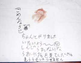 最近ユー兄はしょーもないウソを平気でつく。すぐバレんねん。ママたちにはすぐバレるのにどうしてウソを重ねるかな。先日メガネが壊れたといったときも「コケて壊れた」と言ったけど、顔に一切の傷をつけずにメガネだけが綺麗に壊れることなんてありゃしない。結局それも普段からの扱いの悪さが重なって疲労骨折的にフレームが折れただけの話だった。その時パパはユー兄がウソをついたことをひどく叱った。どんなときでもウソをつくなと言うパパに、もうウソは言いませんと泣きながら誓ったユー兄だったけど、パパはそんなもん、もう信じられるかとつっぱねた。どんだけの覚悟でウソを言うつもりがないと思ってるのかその覚悟を見せろ、なんて言いいながら今、大河ドラマで見ている坂本龍馬を引き合いに出し、「この時代の侍はな、何事も命を掛けて誓うという証に血判をしたもんや。この間も龍馬伝でやってたやろ?お前も絶対ウソをつかへんというその覚悟があるなら血判でもしてみろや。」なんて言い出した。現代は大人でも血判なんかしませんが。あの時代でも子供は血判してたかどうか・・・。ユー兄は「そんな痛いの、やだぁ~。」と言って拒否。まぁ、別にそこまで強いる意味で言ったわけじゃないらしく、「じゃぁ信じない。」と言ってそのまま話は流れていった。その後もたまにこの話が冗談半分に出されることはあったけど、血が怖いユー兄はやだぁ~とお断りしておりました。それが昨日。何かをしていたユー兄がいきなり、「痛っ、痛っ」と顔を顰めてもがき始めた。「ああ~っ、血が出ちゃった。血が出ちゃった。痛い、痛い、どうしよう。ああ、血がっ!」と一人で右往左往しながら騒いでるのを白い目で見ていたママ。何やってんのさ。学校でお友達が紙で指の平を切ったらしく、本当に紙で指が切れるのかと思ったユー兄は実践してみたらしい。でもって本当にキレたので焦ったのだ。バカじゃん「たかが紙で切って血が出たくらいでヒーヒー騒ぐんじゃないよっ!」そう一喝したママ。するとそれでもヒーヒー騒いでるユー兄を見たたいぶーが紙を持ってきて叫んだ。「ユー兄っ!!けっぱん、けっぱん!!」・・・たいちゃん、意外と冷静です。その言葉にハッと我に返ったユー兄は指を押さえながらその紙にビトッと指を押し付けた。ユー兄:「やった!血判押せた!!」なんかすがすがしい顔をしながら血判を押せたことを喜んでいるユー兄。 なんか・・・。血判ってものすごい覚悟を決めて押すハズなのに、なんって軽い文面なんや?それに・・・・・。こんな、アクシデントに乗じて何の覚悟もなく押されただけの血判にどんだけの意味があるのか、ママには全くわかりませんが。