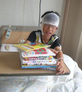 昨日は朝からショー兄とたいぶーを送り出し、学校へ連絡し・・慌しく用事を終えると病院へ。心配せずともユー兄はしっかり朝食を完食していた。ナゼ入院しているのかわからない・・・・。しかも大部屋が空いてないとかで個室だし。さぞかし暇だろうとママは家にあるだけの参考書と問題集を全部持ってきた。 姿は痛々しく見えるけど、実際の傷に対する処置としてはかなり大げさなもんです。10時ごろにママの携帯が鳴り、出ると、なんと学校の教頭先生だった。何事ですか。もしかして我家の広報部員2名がさも自慢話のように昨日の事件を学校中に広めてしまったんでしょうか?いや~っ、恥ずかしいお騒がせして申し訳ありません。入院がどのくらいになりそうかと聞かれ、「本人は至って元気ですぐにでも退院できそうに思えるのですが、様子見がどのくらいになるかまだ分からないんです。」とだけ答えておいた。その後、整形外科の先生に呼ばれて耳の傷が見れるのかと行ってみると、耳の傷を見るのは皮膚科の先生で、ボクは肩と肘の傷を見るのだという。肩の傷?傷なんかあるんですか?見ると、大きく擦ったような傷と打撲の青たんが肩と肘に出来ている・・・・けど。コレが何か?先生:「うーん。大丈夫そうだねぇ。ハハハ。肘と肩をレントゲンを撮るように言われてる んだけど・・・・。」ママ:「レントゲン?! あの、先生、どう考えても骨折はもちろんひびすら入ってないように 見えますが・・・?」先生:「うーん、確かに99%大丈夫そうに見えるんだけどね。皮膚科の先生が随分と気にして らっしゃるし、まぁ安心のために肩だけは撮っときましょうか。」先生。医者が99%大丈夫だと思ってるのなら残りの1%の安心の為にレントゲン代を何千円も払うつもりは私にはないんですがっ。そんなお金があるのなら、たいぶーに水疱瘡の予防接種を受けさせてやりたい・・・と声に出して言えなかった私はやっぱり小心者。当然ながら無傷でした。午後に一旦家に帰りショー兄を英語教室に送り出してから、たいぶーを連れてもう一度病院へ。すると今度は皮膚科の先生からお話が・・・。傷の具合も良好だし、後遺症の心配も今のところはなさそうな感じなので明日にでも退院していいですよ、との事。どの口が一週間だなんて言ったんだ。人騒がせな明日に退院できるなら今日にも出来るはず。個室代が気になるママとしては早く退院したい。ちょっと先生におねだりモードで許可を取り、そのまま即行連れて帰ったのでした。今日はとりあえず一日家で安静にしてました。ところで。昨日学校から帰ってきたたいぶーが自慢げに連絡帳を見せた。見ると担任の先生からのコメントでユー兄の具合を聞く言葉が書いてあった。そして最後に「たいぶー君の機転の利く行動はおてがらでしたね。」と書かれている。機転の利く行動?? なんじゃそら?確かたいぶーは兄ちゃんの怪我に動揺し大泣きしながら大人を呼んできたものの、その後もオロオロして落ち着かず、パパが到着してからはパパの足にビタッと張り付いて離れなかったと聞いてるけど?しかもそのまま大泣きしつづけるのでパパが「なんでたいぶーまで泣いてんの?」と聞くと「だって、かぞくだもん~。」といかにも情に厚そうな発言でパパの感動を誘っていたのだった。さらにたいぶーは言った。「そんでね。おにいちゃんの学年のY先生にもたいぶーくん、えらかったねって言われたんだよ。」Y先生と言えば4学年の学年主任の先生だ。お前はいったいどこまでこの話を広めたんだい?そんでもって自分の行動をどこまで激しく美化してヒーローになろうとしてるんだい?