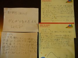 昨日は勤労感謝の日。そんな日でもパパは会社へ出勤だった。昨日が勤労感謝だなんてうちの子が気づくはずもないので、ママがそれとなく勤労感謝の日だからパパにお手紙でも書いてあげれば喜ぶよ、とアドバイスをしてみた。そんなわけで・・・あ、そう?それなら書こうか?的な気持ちで手紙を書き始めた三兄弟。字も汚いし、誤字脱字が相変わらず激しい。読んであまりにガクッときたもんだからすぐに直させた。まずショー兄。『パパへ いつも働いてくれてありがとう。今年は土日も午後は働いて休みもあまりないし 今日みたいな祝日も午前も働いてくれているから、たくさんご飯食べれてます。 これからまがんばってねー。』軽い。気持ちがないのが丸分かり。「これからま」ってなんやねん。「も」やろ?とすぐに書きなおさせた。しかも「自分がご飯が食べれてる」のがパパのお陰だと、そころからの感謝をするあたり相変わらず頭の中は食べる事でいっぱいのようだ。でも感謝状を手作りしたのはショー兄にしては考えたね。さてユー兄。『パパへ いつもいつも働いてくださってありがとうございます。 今日はけいろうかんしゃの日ですが仕事があっておそくなるときいて手紙をかきました。 12月下じゅんになると仕事が少なくなるから、また、テニスコートでテニスをしようね ここで問題です。山があってたにがありそこに人間ふたりがいます。たにの中にいる動物は なんでしょう?』まず『けいろうかんしゃ』でズッコケたね。すぐに直させたけど。丁寧な言葉で書いたのはまぁいいんだけど、最後のなぞなぞは不要だね。さいごにたいぶー。『パパへ いつもはたらいてくれてありがとうございます!! パパは一人だけしかいないからいそがしいね。ママもいそがしいからたいぶーもがんばります。 あしたもがんばってはたらいてください。おうえんしています。 これからもはたらきをがんばってね。 きんろうかんしゃの日。』うん、うん、とにかくもっと働けってことね。馬車馬のように。がんばるたいぶーはいつもお手伝いで失敗してママのイライラを募らせるだけなんだけどね。コレを読んでパパは力が沸いてきただろうか?パパのみぞ知る。