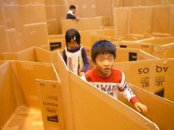 週末は2日間とも出勤だったパパ。なので一人で三人を連れ歩く気力はなく、どこにも行きたくなかったんだけどあまりにもいいお天気だし・・・と子供が大好きな近所の大学のフェスティバルに行ってきた。子供にとても人気のイベント。混むもんだから開始時刻に合わせて出かける。去年も行ったけど、このイベントが大好きな三兄弟。受付にすでに大行列が出来ており、その最後尾に並ぶと、すぐに後ろに並んだのがなんとご近所のたいぶーと同級生の三つ子ちゃんご家族。さらにその後ろに並んだのがツインズの仲良しの同級生F君ご家族。知ってる人に会えたことで三人ともテンション上がりまくり受付が終わったら巨大迷路行こうぜ、なんて言いだして・・・皆家族で行動するのに、ツインズはもうF君兄妹と一緒に行くと決めてしまい、5人の子供は親の都合も聞かずにレッツゴー。え~っ。・・・・・・・なんかF君ご家族の休日についてまわることになってしまう事になってしまった余分三兄弟。ママもついて回るのでF君ご夫妻に気を使わせてしまう羽目になりちょっと申し訳なかった。まず去年も行った巨大迷路。待ち時間40分。 親も写真を撮るために一緒に行くんだけど、これが入り組んでて大人も迷う上に体が大きい分進みにくく体力の消耗が激しい。子供達の進む速さについていけず兄ちゃんの写真はなし。つづいて5人揃ってそのままスポーツ広場へ。サッカーのキックターゲットや野球やらバスケやら・・・。 友達とやると何もかもが楽しいらしい。でもママはずっと立ちっぱなしで待ってるし、この日はやたら暑くてママはダウン寸前。ご飯もF君ご家族にくっついて一緒に取ることになり、気疲れも・・・・・。ご飯の後も工作コーナーの建物に入っていったけど、ついてまわる気がせずF君ママとしばし立ち話で過ごしたのでした。その後はさすがにF家に申し訳ないので渋る三兄弟を一喝して連れて帰りました。やっぱり一人で三人連れまわるのはしんどい。それにしてもこの大学。本当に子供達向けのイベントをよく開催してくれる。以前のサイエンスフェスティバルもそうだったし、この巨大迷路だって子供達の為にあんな大変なダンボールの迷路を何週間も時間を割いて作ってるし。学生さんが子供の相手をするのもとっても上手だしすごいなぁと思う。私が大学の頃って(京都だったけど)自分の大学も含め、近所のどの大学もこんな子供向けイベントをやってるなんて聞かなかったけどなぁ。学祭だってまさに同じ学生同士のためのイベントであって、親子連れがたくさん来てたなんてことなかったもん。この大学独特のものなのかしら。でも付近の子供達との交流を大切にするところはとてもいいな、と感じました。