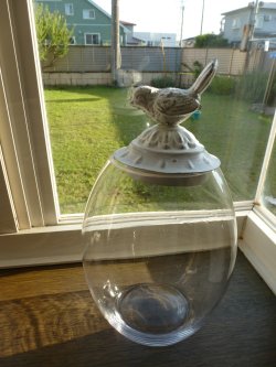 初めて給料が出ました~!8月末から9月上旬までは週1ほどだった事と、研修期間中は少し低めの時給になることと、オープン直前は毎日2時間の講義(無給)があったこと等で少なめだろうなぁと思っていたんだけど、思っていたよりも多かった。お小遣い程度だけど、うれしいなでも・・・・何も買いません。すでに出費してるので。悲しひところで、他にもいいことありたまたまなのか、よくあることなのか知らないのだけど、丁度勤務時間が終了して帰ろうとしたところ、ロッカーのところで社員さんに「いかがですか?」と見せられたもの。ダンボールに入った数点のお店の商品。破損していたり、不良品だったりしたものは処分することになるらしく、そんなもので良ければもって帰っていいよとのことだった。オッサレーなモンばっか。小さな飾り用のガラスのピッチャーもあったりして、G君ママならこれをおしゃれにアレンジして飾るか・・・・売るだろうな。アノ人ならやるでもどれも破損っつったって、しれてるの。私がもらったのはなんかよく分からないインテリア小物。これだってガラスの口の部分(今は隠れて見えない)がすこーーーし欠けてるってだけ。見た目全然わからないのよ。もちろんそれでも商品として使えないのはわかるけど。もったいない。 なんか入れれるだろうと思って。たぶん2000円とかするもんじゃないかって社員さんが言ってました。「何を入れるんですか?」と聞かれたモンで、「アメちゃん・・・・でしょうか。」と答えたら、「さすが関西ですね。アメ『ちゃん』ですか~。」と爆笑。アメ「ちゃん」ぐらいで笑いが取れるとは。とりあえずスーパーでアメちゃん買って入れてみたけど、意外と大きいので下方しか埋まらず・・・・。なんか微妙。せっかくハロウィン月に入るので、何かハロウィン用のお菓子を入れよっかな~。でもそうするとママの目を盗んでバカどもが時間構わず手を出しそう。特にママが出勤した後、子供が登校するまで。危険な時間帯だ壁のトールの作品もそろそろハロウィンに替えて飾らなくちゃね。