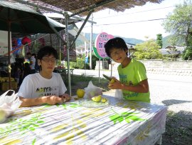 世間は5連休だったようですが・・・・パパは3連休、ママに至っては2連休のみ。ここんとこ連休であろうが週末であろうが帰省以外でどこかに出かけることがなくなった我が家。この連休の中でさすがにたいぶーをどっかに連れて行ってやろうとなった。たいぶーはとにかくお兄ちゃんとどこかに行きたいというのが願いなんだけど兄ちゃんはもうそこんじょそこらじゃ付いて来たがらない。その兄ちゃんを釣るには食べ放題だよね。果物狩りなんてどうかな。たしか去年か一昨年はたいぶー一人連れてぶどう狩りに行ったよね。今の旬だと、りんごとか・・・?りんごは狩るっていっても一個食べれるかどうかのシロモノ。そんなん狩ってもなぁ・・・・。つまらんやろ。栗・・・は後が面倒くさいし。なんて言ってるとパパが「ブルーベリー狩りがあるで。」とのたもうた。ブルーベリー?!以前したことがあるから分かるけどブルーベリーって7月下旬から8月上旬が旬だよね。お盆に入るともうずいぶんと出来るところがすくなくなってるくらいなのに・・・。この時期にまだ出来るなんて・・・。でもたいぶーは「ブルーベリーがいい!!」と乗り気。「それホント?この時期にブルーベリーなんて怪しいな。ちゃんと電話して確認した方がいいで。」というママのアドバイスに従ってパパは電話で確認をした。すると、旬の頃よりかはずいぶんと少なくなってるが広いので探せばそれなりにまだ食べれますとの回答。さらに予約しなくていいですか?と聞くと「まぁ、なくてもいいわな」って感じですんごいアバウトなおじちゃんの答え。そんなわけでその翌日の昨日、久々の家族全員でおでかけとなった。高速乗って、ガソリンが切れそうになったので降りてからまずガソリンスタンドを探すのにすったもんだがあったんだけど、それもなんとか見つけていざ、果樹園へ!丁度お昼ぐらいに着いたんだけど、駐車場を降りてすぐにおじさんが近づいてきて一言。「ブルーベリーね、もうないんだわ。」・・・・・はぁ?何言ってんの、このおっさんちょっとムカッときたママ。昨日電話で聞いたらあるって言いましたよね?するとおじさん「電話くれてた?あ、そう?予約はしたかな?」予約はいらねーってあんたが言ったんやがな!!「8月上旬ならいっぱいあるんだけどね」そんなもんあんたに言われなくても知っとるわ!だから電話でわざわざ確認までしたのに!!!おじさんによると昨日思いのほか人の入りがあったらしく、残ってたブルーベリーがほぼなくなってしまったんだとか。そんな程度でなくなるくらいしか残ってないんだったらなんで当日もう一度確認の電話をくれだとか言わないんだよ!!!不親切にもほどがある!怒鳴りたかったが子供の手前、あまり言いたくもない。呆れて言葉が出ない。あんた、うちらがどこからどんだけ金と時間かけて来たかわかってんの?「せっかく来てくれたのに申し訳ないから、ミニトマトが少しあるから数個食べてって」ミニトマトならうちでも栽培しとるわ!!子供はおじさんに付いていったが、ママはアホらしくて行く気にもならん。めっちゃテンション下がったわ。おじさんの兄弟がリンゴと桃の果樹園を近くでしてるからそっちに行って見てなんて言ってきたけど・・・りんごならこんな遠方までこんだかってもう少し近くにもあったがな、と余計腹が立ってくる。でもリンゴ狩りなら数が食べれない分、500円とかでやってるから、まぁいいか。そう思って仕方なく、おじさんの親族の果樹園へ。するとなんとリンゴ狩り1000円。せ・・・・せんえん・・・・・高いだろ。入口に5個500円で袋が置いてあるんだけどこれでいいくらいだ。でも狩ることに意味がある以上、リンゴ狩りをしなければ来た意味がない。5人で5000円出してまでリンゴもらってもしゃーないし。しかもブルーベリーのおじさんのせいでこうなってるのに親族でも割引すらしてくれない。すでにテンションの低いママはもうギブ。子供三人で行っといで。と、パパママは入口で待機。果樹園のおじさんが子供たちを連れて行ってくれたんだけど・・・。5分ほどで戻ってきた。・・・・・・は?もう終わり?手にはリンゴ3つ。・・・・・・え?小さいとはいえ袋詰め放題じゃないの?1000円払ってんで?そこの袋だって5個入って500円やで?しまった。子供だけで行かせるんじゃなかった。もう文句しか出てこないのだけど、せっかく子供がリンゴを採っていい気分になってるのに台無しにしてもしょうがないと一生懸命我慢。もうどーでもええわ。ママとパパが参加しなかった以上、なんか全然家族で行楽って感じにもならなかったし・・・・・。もう最悪やわ。でも子供はそれほど損したとかそういう感覚はないみたいで、リンゴをもらって大満足してるんだよね。 リンゴジュースがタダだってんで、「吐くまで飲んでやれ」とアドバイス。ユー兄8杯、ショー兄5杯飲みました。すっかりテンションが下がって気分も最悪のママ。どうせならお