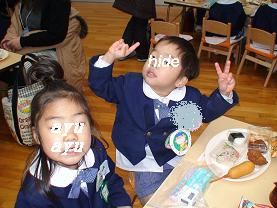水曜日、2月生まれのお誕生会が幼稚園でありました。4回の参加にして、初めて準備・片付けの担当に当たってしまった・・・まーちゃんを連れて、開始の1時間前に到着。半分以上は用務員のおばさんがしてくれていたし、おんぶ紐をして取り掛かったけど、さすがに身軽な方が多いので、私はお箸を配置して、あとは椅子を教室から運ぶだけ^^;年少から年長まで、お誕生月の親子と先生方が揃うので、結構な数だったよ。時間が余ったので、園庭に様子を見に行くと、あーちゃんもヒデも元気に遊びまわってました!ヒデの胸には、担任の先生が作ってくれたカードが。アンパンマンとヒデの似顔絵付きの、メッセージ。沢山書き込んでくれていて、ありがたい限りです。さて、お誕生会は。。。いつもどおり、園長先生のお話~食事~お歌など。いつものお誕生月の園児の歌、ヒデはあまり歌ってなかった(笑)それ以前に、『ヒデくん、座っとこ~』とか言う始末ーー;付き添いのあーちゃんのほうが、元気に歌ってました^^;食事が済むと、先生達から人形劇のプレゼント。子供達は、ステージのそばに椅子を並べて嬉しそうに見てました!まーちゃんは・・・おんぶをしていたので、会が始まる前に寝てしまって。途中でやっと目を覚ましたよ。下ろすと案の定、ウロチョロ=3片付けの時には、教室に勝手に入ってたwそして、気づいたらあーちゃんのクラスのほうのママ友に抱っこされ^^;まだまだしばらくは、行事ごとに大変だなぁ。。もうすぐ4歳。まだまだ甘えん坊なので、大変やら可愛いやら(笑)お話もようやく上手にできるようになってきて、面白いw周りの人にも、『ヒデ君がメッチャ喋ってる!!』と、不思議がられるし(笑)成長も楽しみだけれど、まだまだ可愛いままの、ちっちゃな王子様でいて欲しいな~最近のまーちゃん、ますます成長。『はい、チーズ』と、カメラを向けるとピースをしてるつもりで、一本指を立ててポーズ♪返事もよくしてくれるようになった。出かける時には、『クック(靴)』も言うようになって、一生懸命、自分でお靴を履こうとしてます^-^