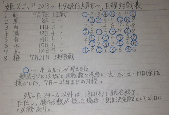 (=゚ω゚)ノコンチャー!今日は初の姫G連合会議でした(。・ω・。)┣¨キ(〃゚3゚〃)┣¨キはぉ♪が合言葉みたいになっていますwこれは黒鯖の姫Gの合言葉なんだそうです^^なかなか使っててかわいい(w´ω`w)姫にあってますね!うちも赤鯖姫Gの合言葉としてなんかつくろうかな(^ω^)会議できまったことは、今回8つの鯖で総当たりをすることです。当初6つの鯖でしたが私たち赤鯖がふえ7鯖になりそのすぐに橙鯖からも参加希望があったそうで、、、ぴーこさん大変wここで本当に締切を迎え8つの鯖の総当たり日程対戦表をつくることになりました。これを紅鯖の姫G GM ひかるさんが担当!!!しかし、8つの鯖になったため一週間でおわらすのは困難になりなんと3週間にひきのばされました(笑)でもこっちのほうが出れる人が多くなると思うからいいと思う(●´ω`●)!!そうこうしているうちにまわりに人が増え、少し恥ずかしかったけれど真面目に会議をくりひろげました。23時をすぎ、ぴーこさんから来週の会議までの宿題をもらって解散^^そして私はすかさず紅鯖のひかるさんに耳をして、、、、、対戦日程表はこれからつくるということだったのでひかるさんにスカイプダウンロードしてもらいはいどーん!!!!!!!!!!!!111勝手に作っておくちゃいました(てへぺろ☆つくったというより、部活のときに校内戦でつかっていた総当たり表というものが手元にありまして^^8ペア総当たり表を使って会議中にかきかきしていたんですよね(ノ)'ω`(ヾ)ほーむるーるを使うGを回数にあわせてかぶらないようにするのだけ少し難しかったけれど10分くらいでおわりました(`・ω・´)ひかるさんの仕事とっちゃって申し訳ない・・・・・・orz首つっこみすぎたかな訳にたてたならよかったんだけど(゚Д゚;)手書きでみにくいかもしれませんけど、これで詳細はっきりしたので参加するかた、興味もっているかたはこれを見て把握しておいてください^^こんなかんじでした!あとは今日、2倍期間でしたね^^悪魔に本気をだしている私はふぉーりんでガンガンレベりんぐをしました^^そのあと装備のかけをして・・・・・・・┣¨キ(〃゚3゚〃)┣¨キ成功した!!!!!!!!!!1wwwwwwwwwwwwwwwwwwwwwwwwwwwwwwwwwwwwwwwwwwwwwwwwwwwwwwwwwwwwwww ↑喜びの雄叫びこの場所アリアンの上のほうなんですけど私はかけをするときいつもここにきています^^大富豪に挟まれて女神をかけてからやると成功するきが・・・・wまぁだれかさんは次に失敗してましたけどねwwwwwwwwwwwwwwwwwwwwm9^Д^)m9^Д^)m9^Д^)ジェトストリームプギャーではおやすみ_〆(・ω・*)