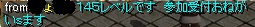 (=゚ω゚)ノコンチャー!今日もいっぱいナンパと叫びしまくったなっちゃんです結果的にいうと現在30名ほど参加者があつまりました^^Gにキャラをいれてくれたかたが約20名。残りのほか数名は開催日ぎりぎりまでレベルをあげて参加しようとしてくれている方、今からキャラを作り、Gにいれてレベルをあげようとしてくれているかたもいます。うれしい限りです!!!ありがとうございます!!また、赤鯖であの有名なぷりさんにもなんぱしにいきました。なんとこのイベントのことをすでにしっておられました。したらばにのったからかなまぁなにはともあれ知ってくれていたことがうれしかったし、そして参加したいとも思ってくれているそうです!!!!(つ`ω´=)しかし鯖間GVありますのでね。。。まだはっきりYESではないですが参加してくれたら本当にうれしいですね(。・ω・。)赤鯖の勝利が少し見えるきが(ry上記はナンパの結果ですがこれから叫びの成果をあげます。 ↓こんな感じで、耳がきたとき本当にうれしかったです!!!!!!今からつくっていれちゃっても全然いいんですよ!!みなさん想像してみてください何十匹ものうさぎがまじわり戦う姿を・・・・・カオス(゚Д゚)!!!!絶対たのしいので参加してみてくださいねー^^そして今日のGVはインテでださしていただきました結果は勝ち!!すっごいたのしかった!!!中盤までずっとまけていたけれど、終盤にさしかかって逆転!!!まさにシーソーゲーム!人数多い中で的がしぼれたのがよかったかな。そしてアランさん神コルΣ(゚ω゚)!!!!!ほんと助かりました><><><><しかも何回もw最後のが一番神コルだったwwwwwwありがとうございます(●´ω`●)明日もがんばります!ではおやすみさない(ρω*)ノ~