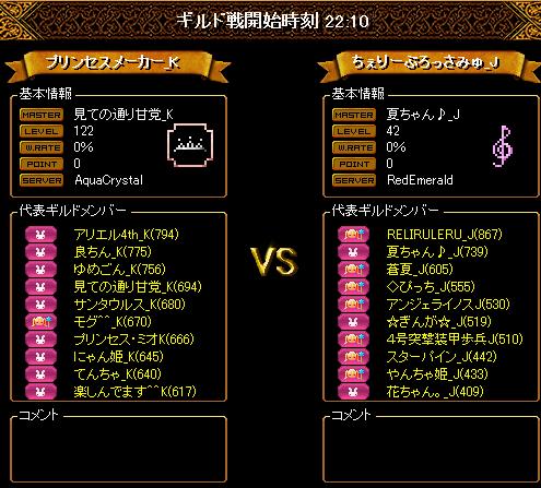 (=゚ω゚)ノ コンチャー!今回は3回戦!水鯖のプリンセスメーカー様がお相手でした^^うーむなかなかのレベルが高い・・・・・今日の集まりは16人で2PT満(*´ω`*)今までで一番少ない人数だ><お相手様は人数が多いときいていたので大丈夫かなぁ・・・・・と心配そして今日もエンジンを組みますそして転送♪なんと転送してすぐとっても嬉しいことが!!!!!!...(*ノωノ)キャ 水鯖の皆さん素敵な叫びありがとぉおお(´;ω;`)なんという統一感!!!ひとりなちゃんってなってるwwはいそしてぇ~今日の一番の目標はPTを早く組むことでした!今までで一番はやく出来たと思います!!なのに水鯖のかたはやすぎwwwGV開始前にもうこっちにこられた><そして戦闘開始です!!良ちんさんが痛すぎる><途中でスキップジャンプでにげていたらなぜかスキップしてる私から逃げる たのしんでます^^さんがいてにげられたら追いたくなる性格なので追いかけると家のまわりを3周くらいずっとまわるはめになりましたww途中から相手もすきっぷしながら周りだしたからなにこれカオスwwwwwってめっちゃわらってしまった'`,、('∀`) '`,、そして戦績!!!2回目の勝利!!!ヽ(゚∀゚)ノ パッ☆対戦ありがとうございました!!!!とっても楽しかったです^^終わったあと水鯖のかたから耳がきましたwこの方もおつよくて、とてもかたかった><多分一回もたおせなかったかなw耳(*´∀`)ノゞアリガトゴザイマス.。.・゚ そして恒例の~今回も参加してくれた皆さん、新しく参加してくれた方☆゚.+:。゚ァリ(*´I `*)ノガト゚.+:。゚☆ 次もかとうね!!(*´∀`)ノ オツカレサマー
