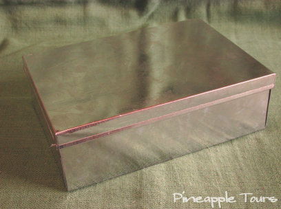 今日のブログはセリアのブリキ レクタングルBOXをサビ風に。 - セリア ブリキ レクタングルBOX -元の姿はこちら。そしていきなり完成。う~ん、なんか違うよね?ねぇ?(誰に言ってる・・・)自分で塗っておきながらなんだけど、なにかが違う気がする。塗ってるんだから違うのが当たり前なんだけど。検索すればもっとそれっぽく見える方法もあるのでしょうが、自己流(?)を楽しんでるので、お気になさらず(苦笑)ちなみに使ったのは、ダイソーのアクリル絵の具、黒、茶、白。中は塗ってないので元の色のまま。底面(上)と蓋の内側(下)白化(?)するまで待っていられないので、水で薄めた灰色(黒、白)を塗っただけ。アップで見るとこんな感じ。黒色と茶色だけど茶色が赤っぽく見えますね。実物を肉眼で見るとあまり感じないんですけどね。