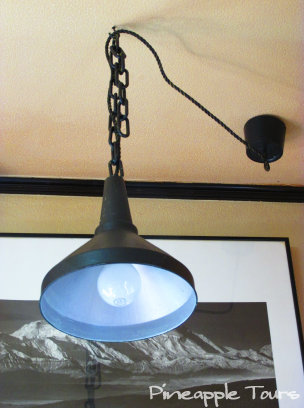 まずは完成写真から。自分がイメージしたライトはこんな感じ。タイトルの通りペンダントライト・・・"風"なので点きません。もし、このブログを見て作る方がいらっしゃるならば、表示されている耐熱温度は60度なので、電球を灯すのには向かないと思います。LED電球ならばそれ以下の温度の物もあるようですが、電球によって温度は違うようなので。材料、1つ目デカじょうご・・・一応、商品名ですから(苦笑)元々は、キャットフードを小袋に移し替える時に、ダイソーに大きなじょうごが売ってあったね・・・なんて話していたのが始まり。それからしばらく経って、そのことを思い出して、見に行ったものの、それと同時にじょうごをペンダントライト風にしてる方をネットで見た記憶までが蘇ってきたんですよね・・・。作りたい精神(?)に火が付いちゃいました・・・ということで。この部分はハサミでも切り落とせます。ただハサミによってはハサミの方が壊れるかも・・・。半分ぐらいで一度切って、それから本体に近いところを切り離したがいいかも。2枚目の写真で上部分にある細長い突起もカッターで切り落としました。じょうご以外の使った材料。ラップの芯又は梱包用フィルムの芯(持ち手)は電球のソケット部分。最初はラップの芯でしたが、もう少し厚みがある方がソケットのように見えるかなと思って梱包用フィルムの芯にしました。カップラーメンの空き容器(プラスチック)はフランジカバー(というらしい・・・)に。コードの接続部分の目隠しですね。プラスチックのチェーンはそのままチェーンに。写真では赤色のチェーン(小さめ)ですが、実際は黄色のチェーン(大きめ)を使ってます(ダイソー)色と大きさは製品によって違うかもしれません。金属チェーンでもいいのでしょうが、重いですよね・・・たぶん。ロープは電源コートの代わり。台風対策用に買ってたものからちょっとだけ拝借。針金とタコ糸は電球やロープの固定用。芯の厚みの違い。ソケットに取り付けた電球風の出来上がり。でも、レトロな感じならば黒色の方がよかったかもと思ったり。ちなみにほんの少ししか見えてないんですけどね。紙筒への固定はこんな感じ。写真はテスト段階の写真なので、簡単に紐で固定してるだけですが、チェーンを固定していた紐がテスト段階で擦り切れたりしてたので、後で針金に変更してます。まぁ、この辺りは止まりさえすればどんな方法でもいいような気もしますが・・・。電球、チェーン、ロープをまとめて留めるとかもありますしね。ただ、どこかをやり直す時にはすべてバラバラになってしまいますけど。電球はボンドや、グルーガンで固定するのと、紐などで固定しておけば落下防止にもなりますし、乾燥を待つ必要も無くなります。構造を分かりやすく(?)するとこんな感じ。じょうごにロープとチェーンを通して、紙筒が当たるところまで引いて、ロープにフランジカバーを通せば、取り付け準備終了。取り付けは、チェーンをどうつけるか悩みましたが、本物風を重視してフックに下げました。ロープの先(コードの先)はフランジカバーがあるので、長めにしたロープを束ねた後に、天井へ虫ピンで刺してるだけです。あとはフランジカバーを被せれば終わり。フランジカバーの穴をロープの太さより少し小さめにしてるので、ずれ落ちることはありません。