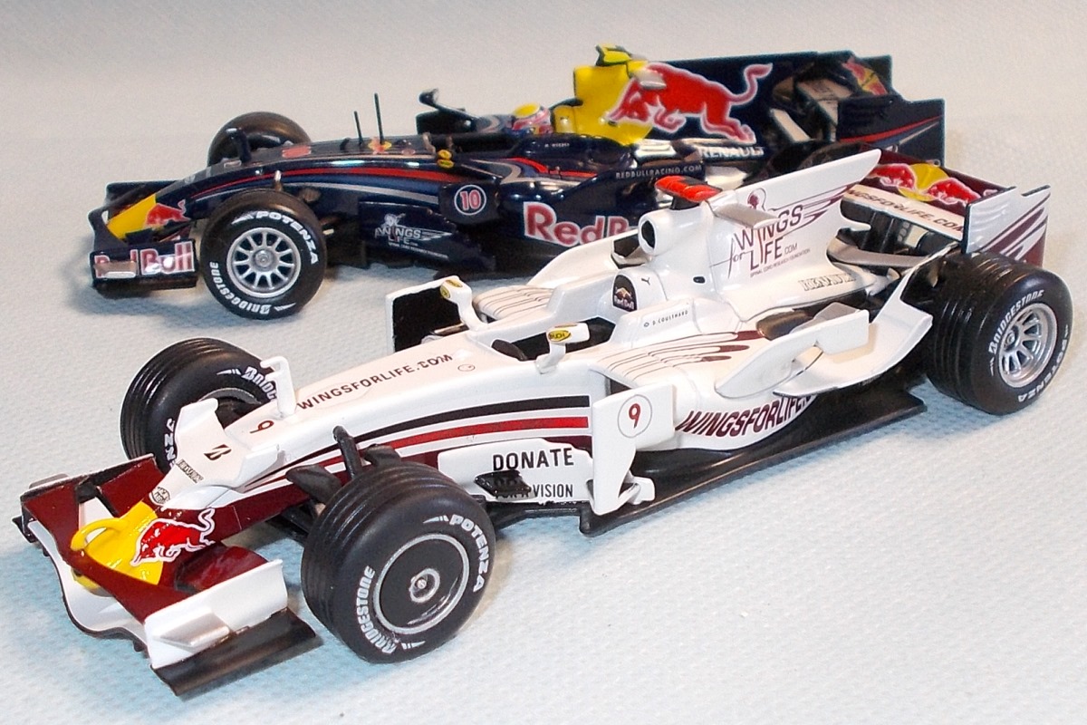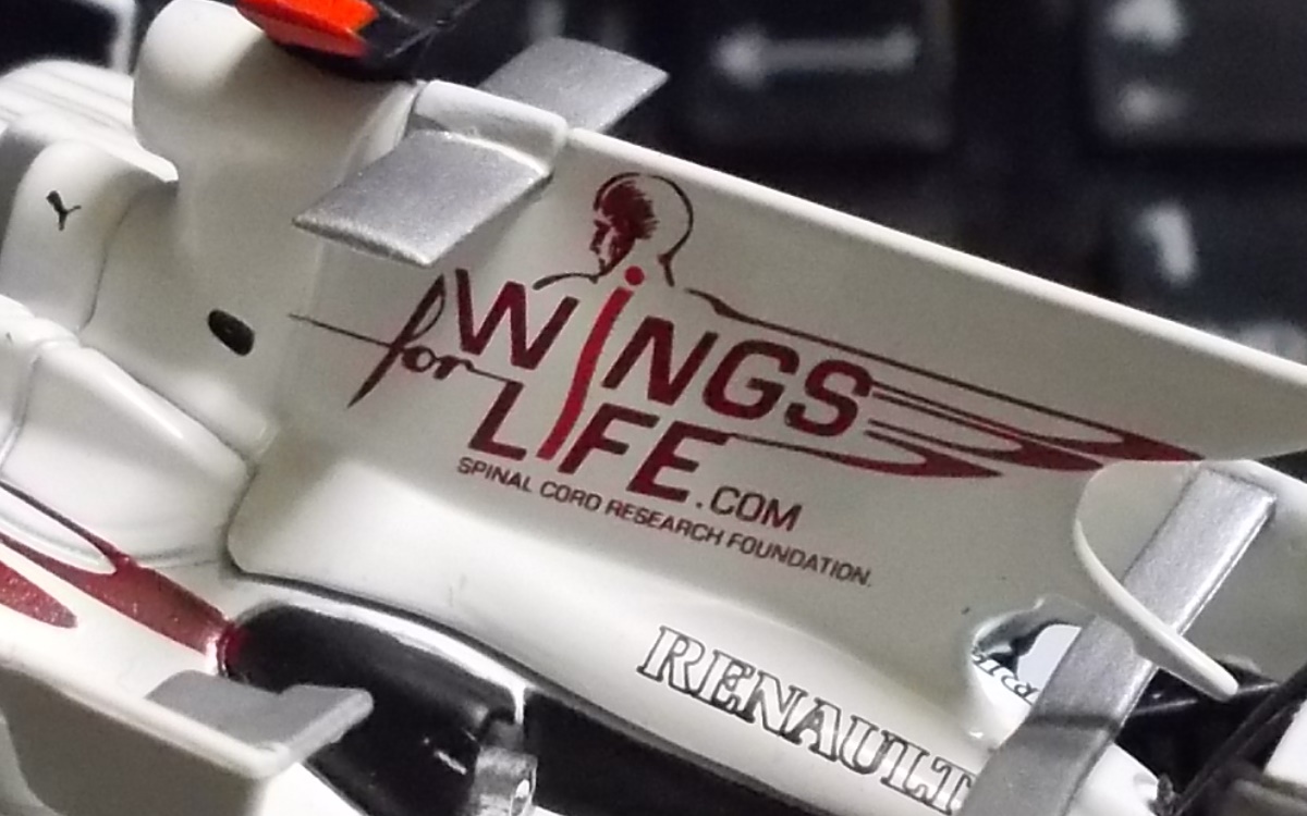 チームメイトのマーク・ウェバーは通常カラー。2台まとめてカラー変更する方が楽(というか申請の必要なし)なのに1台だけを変えたところに、それは引退ドライバーへのリスペクトなのか窓際に追いやられた哀愁なのか判断に困るところだ。BARホンダの例を出すまでもなく、同一チームで別カラーは基本NG。意義のある変更で全チームの賛同が得られればというまずまずハードルの高い行為。まぁマシン上の「ウィングス・フォー・ライフ財団」は営利団体じゃなく脊髄損傷治療法研究財団だから、これを蹴っ飛ばすということはいかな金儲け優先のFOM(当時)でも道義上なかなか出来なかろう。