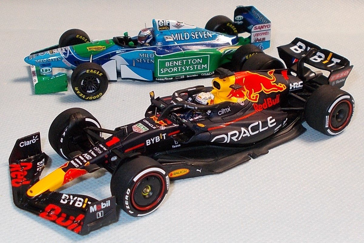 ​​ スパークのシューマッハ ​が歴史考証の全然なってないシロモノだったんでミニチャンプスでリベンジである。シューマッハ車はそれこそ死ぬほど手持ちがあるからどうせならってんでフェルスタッペン父のマシンをチョイス。増資した結果であろうモノコックサイドにでっかくマイルドセブンのロゴが躍る後期型ってのもまたチョイスのポイント。