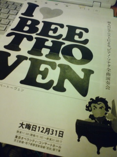 大晦日にちょっとかわったコンサートがあるそうです。ちらしをいただいたのでご紹介します。I BEETHOVEN16人のピアニストによる、ピアノ・ソナタ全曲演奏会東京オペラシティ・コンサートホール 12月31日11:00-終演25:00!? となっております。(ちらしの裏面)楽聖と迎える新年!大晦日1日でソナタ32曲全部16人のピアニストで聴く!演奏スケジュール:11:00 小林愛美 5&1911:35 イリーナ・メジューエワ 9&2712:15 岡田将 4&1613:10 山本貴志 3&614:10 三輪郁 14<月光>&1815:00 辻井伸行 11&29<ハンマークラヴィーア>16:15 三舩優子 7&2817:15 横山幸雄 8<悲愴>&24<テレーゼ>18:10 迫昭嘉 25&3219:00 杉谷昭子 12&1319:45 田崎悦子 15<田園>&17<テンペスト>20:40 若林顕 20&3122:00 菊池裕介 2&2222:45 関本昌平 10&26<告別> 23:30 清水和音 1&23<熱情>24:15 伊藤恵 21<ワルトシュタイン>&301ステージ券=1000円16ステージ通し券=12000円近日中に発売のようです。(オペラシティのホームページも主催のホームページもまだ載っていません)しかしまあ・・・という感じです。恐れ入りましたという企画です。これプロデュースした人はすごいと思います。ピアニストを集めることと曲を2曲ずつ決めることと、これは大変なこと。得意な曲、弾きたい曲、きっと多々あるでしょうし、バッティングしたときどうやって調整したのだろうと、なんとかこれで…とか言って仕切ったのだろうかと、個性派ぞろいのピアニストを見て、溜息つきながら演目表をみてしまいました。こんな1枚のちらしから、年末年始の予定が変わってしまうことも、私にとってはよくあるはなしです。月光ソナタを聴いてから、帰省することになるのでしょうか。それもまたいいことだと、思っています。BGM: ベートーヴェン ピアノソナタNo.14<月光>第3楽章http://jp.youtube.com/watch?v=51ssHG0MtQg ピアノ:アルフレッド・ブレンデル