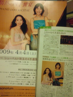 花曇りのいかにもお花見日和の土曜日午後、めったに乗らない井の頭線に乗り永福町で降りました。今日はかなり前から楽しみにしていたコンサート。ぶらあぼ4月号のp.72、ぴっくあっぷというコーナーにも掲載されています。情熱の四手饗宴 PIANO DUO RECITAL(下山静香&高橋舞)~シューベルトの珠玉の4手連弾作品を中心に~会場:ソノリウム(永福町)モーツァルト 四手のためのソナタ 変ロ長調 K.358シューベルト 幻想曲 ヘ短調 D.940ブラームス ハンガリー舞曲集より、第1番・第3番・第6番**シューベルト ロンド イ長調 D.951シューベルト デュオ<人生の嵐> イ短調 D.947(アンコール)ビゼー 子供の遊び op.22から 小さな旦那様、小さな奥様 ブラームス ハンガリー舞曲集 第5番シューベルト 軍隊行進曲**連弾づくし、シューベルト三昧、ここまで徹底した企画であり、よく考えられたプログラミングには圧巻でした。王侯貴族の音楽だったクラシックが市民のものになったころが19世紀で、連弾というものがひとつの文化として流行した、多くの背景が生まれた背景にあったものとして、紹介していただいた感じがしました。あえてサロン風な演出ができるコンサート会場を選び、身近なところから奏でられるピアノの音をただただ楽しんでいました。休憩時間には、このホールの前にお寺があり、満開の桜を見ることもできました。高橋舞さんの企画されたコンサートは、いろいろないきさつもあり、もう3年ほど、聴かせていただいています。きょういただいた案内のなかに過去の演奏もかかれていて、ほとんど聴衆としてかかわっているのがうれしくなりました。http://plaza.rakuten.co.jp/pingpongpang/diary/200603030000/http://plaza.rakuten.co.jp/pingpongpang/diary/200803110000/http://plaza.rakuten.co.jp/pingpongpang/diary/200812110000/BGM: シューベルト ピアノソナタ第21番 変ロ長調 D960
