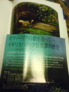 オフィーリアの歌を巡って・・・イギリスバロック狂乱歌の歴史Ophelia's EntourageTracing a history of the English Baroque Mad Songヘンデル没後250年、パーセル生誕350年記念雑貨屋1789こんなめずらしい企画のコンサートがありました。場所はオペラシティ3F,近江楽堂スライド映写を使って、チェンバロの演奏と歌を聴きながら、絵画を映写機でみたり、大学の講義のような狂乱歌をテーマにしたレクチャー。現在、ロンドン大学ゴールドスミス校音楽学部で講師をされている松本直美さんからのお話は深いものでした。前半は男性が歌う狂乱の歌、後半は愛に狂った女性の歌 というプログラム構成でした。<プログラム>ルイジ・ロッシ:僕の命も奪ってください、ああ、なんという苦しみ!オペラ<オルフェオ>よりジローラモ・フレスコバルディ: ルージェーロペースによるパルティータ <チェンバロ・オルガンのためのトッカータ第1集>よりG・F・ヘンデル:ああ、スティックスの亡霊が オペラ<オルランド>より作曲者不明: 狂乱のトム(俗揺)ジョージ・ヘイデン: カンタータ「新・狂乱のトム」****ウィリアム・バード: ウオルシンガムの主題によるファンタジー <フィッツウィリアムヴァージナル曲集> <ネヴェル夫人の写本>より作曲者不明 狂乱のモードリン(俗揺)ヘンリー・パーセル: カンタータ「狂乱のペス」トーマス・モーガン おいで、天上に棲まう者たちよ <成功した異邦人より>ヘンリー・ケイリー カンタータ 「神よ!これには耐えられぬ」***イギリスの音楽史はほとんど知識がなく、シェークスピアの戯曲に精通しているわけでもなく、そういったなかでコンサート聴きました。ヘンデルは、ドイツ生まれのイギリス作曲家ということにご当地ではなっている。イタリアのオペラはフランス経由でイギリスに入ってきて影響を受けた。18世紀、音楽ではパーセル、文学の世界ではシェークスピアを母国の誇りとして持ち上げようとした。ということなど、いろいろ伺いました。チェンバロをかぶりつきのような席で観ていてただただ感動しました。終演後、近江楽堂にあるチェンバロを間近で眺めました。鍵盤がかわいらしく、白と黒が反対になっていて、少し鍵盤小ぶりな感じがするものが身近に感じて、しばらくずっとそこにいたくなりました。映像で、いろんな絵が表示されましたが、ミレーが描いたオフィーリアの絵もそのひとつでした。10年ほど前、テイトギャラリー展の画集を見直したら、やっぱりそこにもありました。本棚に眠っていた画集をまた観ることができてよかったです。そういうわけで、画集と本日のちらしの写真にしました。雑貨屋1789のメンバーは、3人ともイギリス・フランス・ノルウェーと異なる留学先で、さまざまなキャリアをお持ちのようで、同じ音大の同窓の方がこうして集まってライブをやられること、志の高さを感じました。