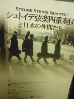 ほとんど聴きなれないなまえなのですが、フォルクハルト・シュトイデ氏は1971年生まれ、ウィーンフィルハーモニー管弦楽団のもっとも新しいコンサートマスター。ウィーンフィルのコンサートマスターは、キュッヒルとかホーネックとかは存じ上げていますが、若いコンサートマスターです。シュトイデ弦楽四重奏団は、ウィーンフィルのメンバーで構成され2002年に結成。日本ではウィーンフィルのメンバーとしては、何度か来日しているのだと思います。今日は、東京オペラシティで、コンサートがありました。<プログラム>ハイドン 弦楽四重奏曲 第78番 変ロ長調 「日の出」 Op.76-4 Hob.III-78シューマン ピアノ五重奏曲 変ホ長調 作品44 (ピアノ:三輪郁)**モーツァルト 弦楽四重奏曲 第14番 「春」 K.387(アンコール)シューベルト 弦楽四重奏曲 第12番 ハ短調 「四重奏 断章」D.703春のよき日に、ほんとうにすばらしいプログラムでした。ライブでなければ伝わらないやわらかな空気というものも感じました。こんな贅沢な時間をすごせて感激です。シューマンのピアノ五重奏曲・・・はまりそうです。シューマンの曲のプログラムノートに、弦楽四重奏にピアノを加えた編成は、音楽史上、初めて成立したのが、この作品なのだそうです。「元ピアニスト志望のシューマンの作品だけあって、ピアノは常に主導的な役割を果たしており、ト気にはが曲に重厚な響きを与え、また時にはきわめてソリスティクな、華やかなピアニズムを展開している。第4楽章のコーダには再び第1楽章の冒頭のテーマがフーガ風の形で現れ、喜びの絶頂のうちに幕を閉じる。」と書かれています。喜びが絶頂のうちにまた聴きたいです。●ちらしをいろいろいただいて、日本オーストリア交流年2009 国交樹立140年の年で、いろんな記念の催しもあるようです。秋にはウィーンフィルも来日するようです。指揮:ズービン・メータサントリーホールには9月15・17・20・25日と4回あるようです。(詳細は以下のとおり)http://www.suntory.co.jp/suntoryhall/sponsor/090915.html明るい音楽を聴いたので、今日はかなり前向きな気分になっています。
