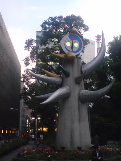 銀座4丁目から、数寄屋橋の方向へ歩いていきました。アルマーニとかグッチとか、そういうテナントのビルがにぎやかだなあとおもっていたら、こういう時計台がありました。太陽の塔のミニ版のようで、仮面ライダーがショッカーのたたかったあとたたかう相手のようで、みていておかしくなりました。数寄屋橋は、昔本当に、数寄屋橋という橋があったことは、ずいぶん後になって知りました。東京オリンピックの手前、首都高速道路を造るために外堀通りの堀を埋め、私が見る景色はもっとあとのこと。昭和56年に日劇がなくなり、その後マリオンになってからが、私の知っている姿。マリオンには阪急百貨店があるので、関西人の私にとっては、文字をみるだけで癒される場所だったりしました。東京で一人暮らしをはじめたころ、ここに時々いってスーツを買ったりもする場所でした。デパートの顧客を集めるための言葉として、シャワー効果と噴水効果というのがあるのですが、見事に生かされているように感じる場所でもありました。シャワー効果とは、階の上のほうに目玉になる催しもの会場を置いて、それが終わった後、お客様が降りて来て買い物をしていただくといった意味。このビルには多数の映画館が上の階にあります。噴水効果とは、デパ地下など食料品売り場を充実させて、そこからお客様が上がってくるという、お客様の導線を考えてのもの。スーツ屋さんの店長さんとあーでもないこーでもないといいながら、2時間くらい遊んでいたこともありました。●阪急という文字をみていると、阪急電車に乗りたくなりました。これは去年の夏休みに実家に帰ったとき、阪急梅田駅での写真。チョコレート色、電車の中は木目調、グリーンのシート。吊革広告は月刊誌のみなので、なんだか落ち着きます。小林一三さんという阪急の創業者、私は尊敬しています。タカラヅカを作ったのも、沿線開発をするために線路をひいたのも、映画を日本で定着させたのも(東宝のこと)、この人がされたこと。カレーライスのとなりに福神漬を置いて、デパートの食堂で大ヒットさせたのもこの方のアイデア。実家に帰る用事があるので、あさってこの電車乗るのが楽しみです。●たそがれ清兵衛の映画、テレビでやっています。真田広之さんが出ていますが、かつて「里見八犬伝」という映画のキャンペーンのアルバイトで朝早く、阪神競馬場へ行ったとき、阪急電車に乗り仁川という駅で降りていきました。「朝早くからわれわれの映画のために来てくださってありがとうございます。」と映画に出る人の馬の世話係で出かけたのですが、真田さんが私に、深く頭を下げられたこと、いまだに覚えています。仕事をする以前にひとりの人間としてすごいと思いました。なんだか、そんなことも思い出してしまいました。