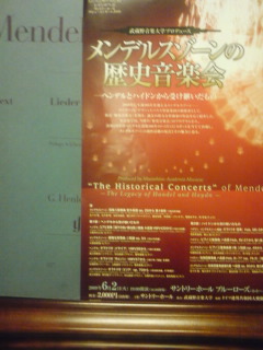 レインボウ21 サントリーホールデビューコンサート2009武蔵野音楽大学プロデュース「メンデルスゾーンの歴史音楽会-ヘンデルとハイドンから受け継いだものー」<プログラム>メンデルスゾーン 弦楽八重奏曲 変ホ長調 op.20から第1楽章☆第1部 ヘンデルから受け継いだものヘンデル 鍵盤組曲第1巻第5曲 ホ長調 H430から第4楽章 エアと変奏「調子の良い鍛冶屋」メンデルスゾーン 厳格な変奏曲 二短調 op.54 ヘンデル オラトリオ 「メサイア」HMV56から 第1部第17曲 二重唱「主は羊飼いのようにその群れを養い」ヘンデル オラトリオ 「サムソン」HMV57から 第2幕第4場 レチタティーヴォ 「わざわざそんなことを言いに来たのか」 二重奏 「腰抜けめ、失せろ」メンデルスゾーン オラトリオ 「エリア」 op.70から第2部 第26曲 アリア 「主よ、事たれり」 第28曲 天使の三重唱「山に向かい、目を上げよ、かしこから救い来たれり」☆第2部 ハイドンかr受け継いだものハイドン/メンデルスゾーン編曲 オラトリオ「四季」 Hob.XXI-3 から序曲(日本初演)ハイドン ピアノ三重奏曲 ハ長調 Hob.XV-27 から第1楽章メンデルスゾーン ピアノ三重奏曲第1番 二短調 op.49 から第1楽章ハイドン 弦楽四重奏曲 Hob.III-77 op.76-3 「皇帝」から第2楽章メンデルスゾーン 弦楽四重奏曲第6番 ヘ短調 op.80から 第2・第4楽章とてもよく練られた企画、すばらしいコンサートでした。メンデルスゾーンは、1829年にバッハのマタイ受難曲を100年ぶりに蘇生させたことで、よく知られていますが、これ以外の作曲家のコンサートもいろいろ取り上げたそうです。1838年、1841年、1847年と3シリーズにわたり、12の「歴史音楽会」というのを催し、上記の演目は、そのときのプログラムに入っていたもの。2-3日前に聴いた、飛行機内でのメンデルスゾーンのBGM同様、愛着のこもった演目であり、演奏でした。いろんな切り口で、メンデルスゾーンのコンサートがあり、今年は楽しいです。ピアノだけでなく、歌あり、室内楽あり、アニバーサリーの作曲家と聴き比べをし、斬新なところにいれて、うれしかったです。BGM:メンデルスゾーン ピアノ三重奏曲 op.49 第1楽章http://www.youtube.com/watch?v=vp1TRzMeIOUメントリ ということばをピアノの専門のひとに聴いたことありますが、ここ10日でずいぶん聴く機会を得て、ますます好きになりました。