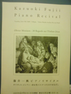 夕方の会社の会議、17:30に終わるはずが、18:20手前で終了。でも上野だし、東京文化会館だしと、最寄り駅までタクシーに乗り、地下鉄&JRでホールまで。 開演3分前にホールへ。でもなんだか淡々とした感じでした。あわてふためなくなった分、場数を踏んだのかもしれません。藤井一興ピアノリサイタルオリヴィエ・メシアン 幼な児イエスへの20のまなざし1.父のまなざし/2.星のまなざし3.交換/4.聖母のまなざし5.子を見つめる子のまなざし/6.それにすべてはなされたり7.十字架のまなざし/8.高きみ空のまなざし9.時のまなざし/10.喜びの聖霊のまなざし・・・11.聖母の初聖体/12.全能のことば13.降誕祭/14.天使たちのまなざし/15.幼児イエスの接吻16.預言者たち、羊飼いたちと博士たちのまなざし17.沈黙のまなざし/18.怖るべき感動のまなざし19.わたしは眠っているが、わたしの魂はめざめている20.愛の教会のまなざしパリ国立音楽院で作曲科、ピアノ科を卒業されていますが、メシアンに師事されています。そんなピアニストの演奏というのも、そうそうあるものではありません。玄人はだの聴き手もそれなりにいたようにも思います。文化会館小ホールは、ピアノを聴くのに好きなところのひとつ、ぴんとはりつめた空気のなか、暖かい音を激しい音、多彩な音色をもつ、藤井先生のピアノをひたすら聴きました。メシアンはそれほど聴くことありませんので、細かいことはわかりませんが、楽譜を立てながら、真剣なプログラムでの演奏とあって、たいへん感動しました。●休憩時間中、誰を探すわけではなく、ぼんやりしていたのですが、どこかで見たことある人もやっぱりいるなあと思いながら、はっとさせられました。目の前に会社の先輩にばったりとお会いしました。辞められているので7年ぶりということになりました。 以前、深夜残業していて夜中1時過ぎに、突然ピアノのはなし、クラシック音楽のはなしになり、気がついたら夜が明けていて、土曜の朝に家に帰ったこともありました。北京へトゥーランドットへ聴きに行ったり、シューマンのアラベスクを聴いてもらったり、10年前のことをいろいろ思いだしました。ぴんぽんぱんの原点のころのひとつのできごとかもしれません。「ご飯をつくって待ってくださる人はいらっしゃらないのか・・・」と聴かれましたが、「そのうちに・・・」としか答えようがありませんでしたが、笑ってしまいました。おかげさまで楽しい1日になりました。