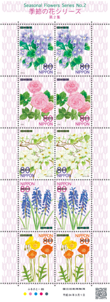 http://www.post.japanpost.jp/kitte_hagaki/stamp/furusato/2011/h240301_f.html記念切手は、親が集めていた関係で子供のころから、よく眺めていました。自分自身、収集するというより、使うために、ときどき1シート購入します。最近買った記憶のあるものでは、道後温泉に行ったときご当地の切手、東京文化会館50周年のときの切手。今回のものは、季節の花シリーズ第2集というものだそうです。スミレ、バラ、ハナミズキ、ムスカリ、ポピー2枚1組で10枚1シート。とてもきれいです。近く、郵便を出す用事があり、日本橋の郵便局で見つけました。5種類それぞれで、出す相手を思い浮かべて切手を貼るのは、アナログですが、自分にとっては楽しい作業です。3月のはじめごろ、気が付けば最近毎年同じようなことをしています。BGM: ドビュッシー アラベスクNo.1http://www.youtube.com/watch?v=A6s49OKp6aE