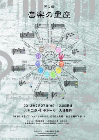 http://ongakunoseiza.otaske.net/ プログラム【第1部】王のエスタンピ第5 モーツァルト/デュポールのメヌエットによる9つの変奏曲 ニ長調 K.573 モーツァルト/ヴァイオリン・ソナタ K.304 モーツァルト/交響曲第40番第一楽章(連弾) シューベルト/ワルツ レントラーとエコセーズ D.145より ワルツ10,6,2、1番 メヌエット イ長調 D.334 ベートーヴェン/ピアノソナタ 第8番 Op.13 「悲愴」第1楽章、第3楽章 【第2部】リスト/3つの演奏会用練習曲S.144より第2曲「軽やかさ」 シューマン/ノヴェレッテ 第1番 Op.21-1 シューマン/フゲッタ形式による7つの小品 より Op.126-1 シャミナード/主題と変奏 Op.89 ブラームス/間奏曲 Op. 118-1, 118-2 柴田淳/雨夜の月 松本俊明/Moonshine~月あかり~ グリーグ/春に寄す シューベルト/即興曲Op142-4 【第3部】ショパン/バラード1番 ショパン/バラード第3番 ドビュッシー/『前奏曲集 第一巻』より「野に渡る風」「亜麻色の髪の乙女」「アナカプリの丘」 プーランク/即興曲第7番 シューベルト/即興曲第2番(Op.142-2) 塩谷哲/4→0→10→5 ポール・モーリア & ジェラール・ガンビュス/Eva スカルラッティ/ソナタ イ長調 K.39, L.391 【第4部】ベートーヴェン/ピアノソナタ第21番 Op.53「ワルトシュタイン」第一楽章 ベートーヴェン/ソナタ第24番「テレーゼ」Op.74 第1楽章、第2楽章 シューベルト/即興曲 Op.142-4 武満徹/「雲」 こどものためのピアノ小品より メンデルスゾーン/幻想曲「スコットランド・ソナタ」Op.28 第一楽章 ベートーヴェン/バガテル Op.126より、3、4、5 シューマン/ウィーンの謝肉祭の道化 Op.26より 間奏曲・フィナーレ 【第5部】ハチャトゥリアン/組曲「仮面舞踏会」より ワルツ ブラームス/ハンガリー舞曲 第5番 ラヴェル/水の戯れ アルベニス/12の性格的小品集 作品92から「祈り」 アルベニス/タンゴ Op.165-2 グラナドス/アンダルーサ Op.37-5 アルベニス/前奏曲 Op.232-1 ラヴェル/ソナチネ 【第6部】Billy Joel/ワルツ第一番(ナンリーの回転木馬) リスト/巡礼の年報第2年イタリアより 5ペトラルカのソネット第104番 ラヴェル/ボロディン風に バーバー/ピアノソナタ Op.26 第1楽章 ラフマニノフ/ピアノソナタ2番 1楽章 アルカン/すべての短調による12の練習曲Op.39より第4番ハ短調「交響曲 第1楽章」 ショパン/ノクターン op.62-1 【第7部】モーツァルト/ピアノ協奏曲 第26番 戴冠式 第一楽章 K.537 モーツァルト/ピアノ協奏曲 第10番 (2台のピアノのための協奏曲) K.365 インファンテ/アンダルシア舞曲より "優雅に(エル・ビト)" ラヴェル/ラ・ヴァルス フォーレ/レクィエムよりサンクトゥス ●今年で5回目となる音楽の星座。5回続けて参加させていただくことになりました。関係者のみなさまにはただただ感謝するばかりです。今回は3部で、プーランクとシューベルトの即興曲を2つ並べてみるということにいたしました。即興曲とひとことで言っても、フランス人とオーストリア人では、19世紀と20世紀では、それぞれの様式があるようでして、それでいて、弾いているあいだは、ちょっとミニトリップしているような楽しい感覚になったりしています。いつも同じように弾かなくていい、そのときの気分気分で感じるままの音楽にすればいいのではと、お世話になっているピアニストのせんせいには言われたりもしました。フランス人が作ったからとかオーストリアの人が作ったからとか、あまり意識せずに、奏でられるといいかもと思っております。この回に続けてださせていますが、自分自身が弾いた曲を次の年に弾いてくださる方がいらしたりして、自分自身たいへん励みになったりします。昨年はドビュッシー三昧でしたが、弾いていた曲のつぎに自分が弾くのは、ますます弾く気にさせてくれるような感じにしてくださったのだろうと推察いたします。 BGM:ブラームス 交響曲第4番 Op.98 第2楽章 http://www.youtube.com/watch?v=duiJ6hwzrG0ブラームスの交響曲のなかでも好きな楽章です。