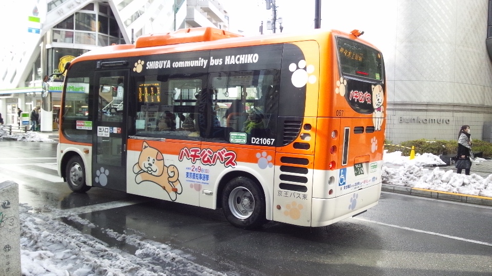 ハチ公バスは、乗らなかったのですが、雪の日にカラフルな車体が絵になったので、記念撮影し、アップすることにしました。渋谷から松濤をとおって、代々木上原まで行くコースです。NHKホールの近くの渋谷区役所で赤いバスとオレンジのバスと青いバスと3つに遭遇できます。2月9日の東京都議会選挙もしっかり宣伝していて、区が運営していることよくわかります。いろいろありますが、東京都知事の方は、任期満了まで、いい仕事をしていただきたいです。●建国記念の日のおかげで、ひさしぶりに飛び石連休。仕事の振替休日もあり、4連休はちょっとありがたかったです。出かける用事があったおかげで雪景色見れましたし、ピアノ弾こうという気にもなったし。それにしてもシャープ6つの曲は、譜読みができているようでできていない感じで、こういったときは左手のベースラインが重要なのだと思い知らされています。少しでもいい感じに仕上がりたいので、いろいろ思案しながら綺麗な流れにしたいものです。しばらくテレビはオリンピック三昧になりそうです。カーリングの試合を長い時間かかるもの、久しぶりに見ていました。かなりクレバーにならないといけないスポーツは楽しいものを感じました。やるべきことはわかっていても、なかなかうまくいかないのは、楽譜とピアノのおけいこと共通しているのかもしれません。BGM:モーツァルト ピアノソナタ 第8番 K.310 第2楽章より (ピアノ:内田光子)(1) 最初の5分ほどhttp://www.youtube.com/watch?v=P49E6RUDy58(2) 展開部以降http://www.youtube.com/watch?v=BLbunvM4s0kドラマティックな緩徐楽章は大好きです。オペラを聴け、ここは交響曲の短調のものと似ている、、ここはオペラのアリアだといろいろ言われ、たいへん勉強になったことおもいだしました。