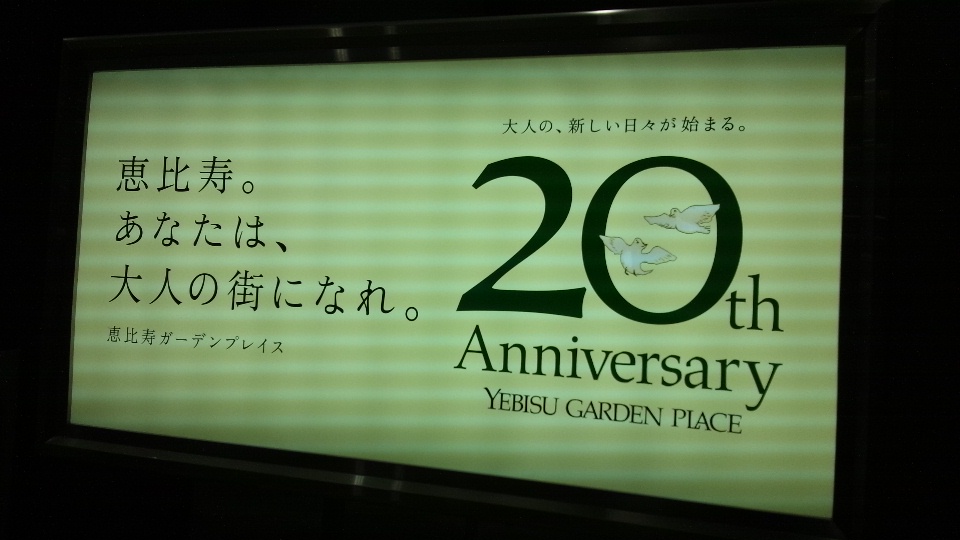 恵比寿ガーデンプレイスへは、お世話になっているピアニストの後援会の理事会があり、(僭越ながら理事なんていうものを仰せつかっています)半年に一回伺うようになりました。今日は、このような看板を眺めて、充分大人な街・・・ということを知っているものの、思い切ったコピーだなあということと、20周年でこんなに時間がたったのかということとで、ちょっと感慨深くなりました。ピアノを通じて、いろいろお世話になった多くの方と行き来しはじめたのも、サッポロビール記念館に戦前に眠っていたスタインウェイのピアノがあったからだとおもいます。それを無料で弾かせてもらえるという企画がピアノを再開しはじめた時期とちょうどかぶっていまして、最初は人様の発表会や演奏を聴いているだけだったのですが、自分が弾くことになったというのがありました。シューマンの飛翔とかアラベスクとか弾いていて、恵比寿三越の買い物帰りのご婦人の方々がいっぺんに集まってきたときは、さすがにびっくりもしましたが、ちょっとうれしかったり。そんなこともありました。もう15年近く前のお話しです・・・・。そのときのように、今でも楽しくピアノが弾ければいいなあと思います。街も大人にということですが、自分もさらに大人になりたいです。BGM:シューマン 幻想小曲集 Op.12-2 「飛翔」 (ピアノ:ルービンシュタイン)http://www.youtube.com/watch?v=32AhAWKohz4