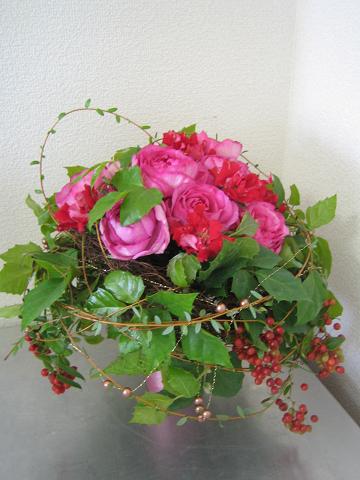 「人に色々な人がいるように 同じ種類のお花にも いろんな個性がある。それを皆 包み込むのが 愛なんだよ。」そう 尊敬するデザイナーに言われた。 お花が身近になった一言。 写真は、私にとって とても大切なきっかけを与えてくださった、愛情に満ちた女性に 友人達と贈った物。リッツカールトン大阪で行われたPARTYにお届けしました。とても華やかな女性なので パールをあしらい、足元はリボンで処理してあります。赤い実は 実りの象徴として 使いました。 とても頭が良く、 どんな時も 優しく包み込んでくれる憧れの女性です。 私なりに お花と対話できる自分で ありたいと思う。依頼してくださる方の「想い」を 大きく暖かく お花が届けられるようにもっと 深く お花を 感じたいと思いました。