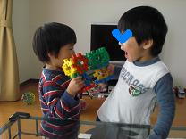 今朝、ご飯を食べてから1時間後末っ子のまるが 『うんちでた~』 と教えてくれました。 オムツを替えていると 『お腹すいた~』 と一言 (@_@;) どうやらもうお腹がいたよう!!いつもならばおやつを与えてしまうのですが、 最近太る傾向にあるまるくん今日は我慢だ~!! 気分を切り替え Let’s ブロック遊び~♪♪ 長男のバンビが積極的に作っていると思えば グラス!! 『ルネッサ~ンス カーン』 なんてやってましたよ。もう古いかな!? あらあら・・・まる鼻つぶれちゃってるよ~(^_^.) そんなに顔に押し付けて飲むから鼻つぶれるのッ!!この画像じゃ見づらいかな!? なにはともわれ楽しんでいたご様子の息子さん達。 もうすぐお姉さまが帰ってきますよ!今度は何をして遊ぼうかなッ♪