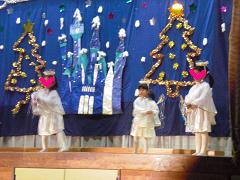 おゆうぎ会♪ 無事終わりました。みんな、かわいかった~ヽ(*・ω・)人(・ω・*)ノ☆そして感動した~!! なによりも場所取りが大変でした。いい場所が取れなくて、なんとかビデオは撮れたけどカメラの方はピンボケばかり!かわいかったのに残念。↑上の写真は一番写りのよかったモノを載せてみました(*^^)vなんとなく雰囲気だけでも伝わればと。。。 あっそぅそぅ(^。^) 娘は何をしたかというと ダンス♪クリスマスソングに合わせてとっても上手に踊っていました(^o^)一応役みたいなのがあって、娘は天使☆白いキラキラ衣装に冠とステッキ。かわいいかったな~☆ 写真に残したかった~。 自分のやりたい役をやれたみたいで、ぴょんらしい役を選んだな~と思いました。