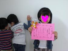 今朝、家の倉庫を突風で車に直撃させてしまった人に会いました。 『車、修理から戻ってきたよ。なんだかわるかったね~』 と言われ。 いえいえ、こちの方が悪いですから・・・。とりあえず、修理が完了したことで一安心。 すっごくいい人で当時も『車なんていいんだよ!アハハ』って、 普通怒るところ・・・ 逆に『ごめんね』なんて謝られて。 全然悪くないのに、恐縮してしまいました。 こんなに言い人に初めて会いました。ちょっと・・・いい話?しでした。 さてさてッ♪ 先日娘の幼稚園でカルタとり大会がありました。 見事o(^-^)o☆学年で2位を獲得☆メダルと賞状を貰ってきました! 1位は何人いたかわからないけどお見事☆ やったねッ(*^^)v後ろで弟くん2人が写らない様に隠れてたけど・・・入ってますから。 次は1位をとると意気込んでいました!頑張れぴょんp(^^)q