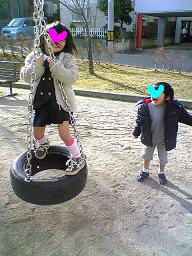娘の通ってる幼稚園では19人がインフルエンザかかりました。お友達も予防接種していたのにかかってしまってかわいそう。予防接種したからといって油断禁止ですね!! でもでもやぱっり外で遊びたいッ♪天気がよかったので人の多い公園を避けお庭で遊びました。お庭では、三輪車乗り、ブランコ、フリスビー、ボール投げをしましたよッ♪ 誰が先に前乗る??? よし!!お兄ちゃんから行くよ~!! 次、弟頼むよ~!!お兄ちゃん重い~(>_<) 今度はブランコ♪お兄ちゃん楽しいよ~♪ 楽しいけど、後ろなんかおる??? 飛行機だッ☆ こら~立ち乗り禁止!! 今日は上に着なくとも暖かい(*^_^*)あ~楽しかった♪♪お姉ちゃんの使っていたミニーちゃんの三輪車もなかなか似合ってたし(笑) お家入ったらしっかり手洗いうがいしないとね!!今日、弟のまるはお口くちゅくちゅのほかにガラガラもできるようになったね(*^^)v