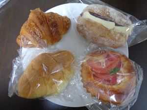 クロワッサン(モンスティル)、禁断のあんバター、塩バターロール、りんごシュプレームをテイクアウトしました。どれもおいしかったです。